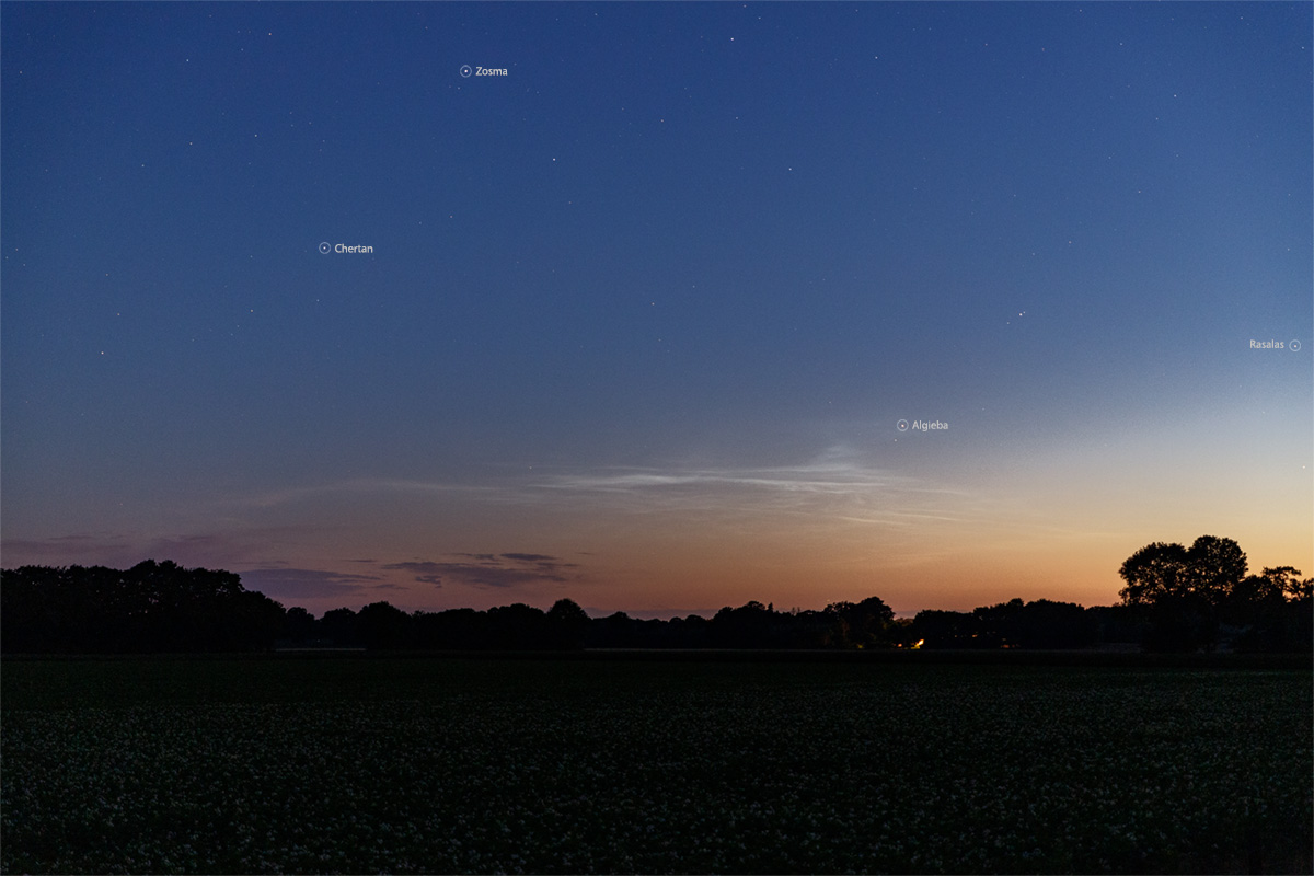 Dort angekommen, war das Feld in nordwestlicher Richtung mit einer Helligkeit von ca. H2 noch gut zu sehen, aber Richtung NNW ließen sich weitere NLC erspähen. Noch schwach, aber etwas höher und heller werdend.