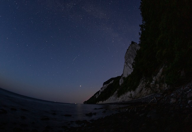 In den frühen Abendstunden startete ich meine Wanderung entlang des Kreidefelsen-Ufers zwischen Lohme und Sassnitz. Um 20 Uhr Ortszeit, angekommen am Königsstuhl, konnte ich dort mein Nachtlager errichten und wartete schließlich auf das, was da kommen könnte. Die Dämmerung setzte ein, erste Himmelskörper wurden sichtbar und es passierte: Nichts. Zumindest nichts, was NLCs angeht. Über dem Königsstuhl gab sich derweil bzw. im späteren Verlauf die Sommermilchstraße zu erkennen, mit welcher ich mich erst einmal beschäftigte.