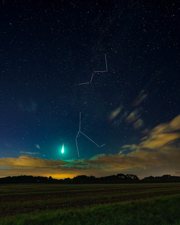 Bei nächtlichen Landschaftsaufnahmen konnte ich eine Feuerkugel mit Lichtblitz einfangen. Aufgrund der Herkunftsrichtung vermute ich, dass es ein Perseid war. Einen Knall gab es nicht.