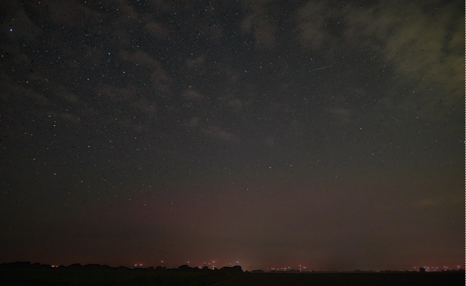 Mein Bild ist um 0:13 Uhr entstanden. Ca. N 53.7°, E 9.7°. Blickrichtung Nord-Nordwest. Die Lichtverschmutzung ist ziemlich sicher Elmshorn. Ich hatte aber gedacht, dass am linken Bildrand eventuell eine leichte Verfärbung zu erkennen sein könnte.