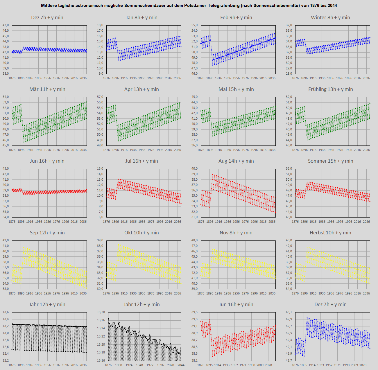 In den Diagrammen sind jeweils die mittleren täglichen astronomisch möglichen Sonnenscheindauern (=Tageslänge)