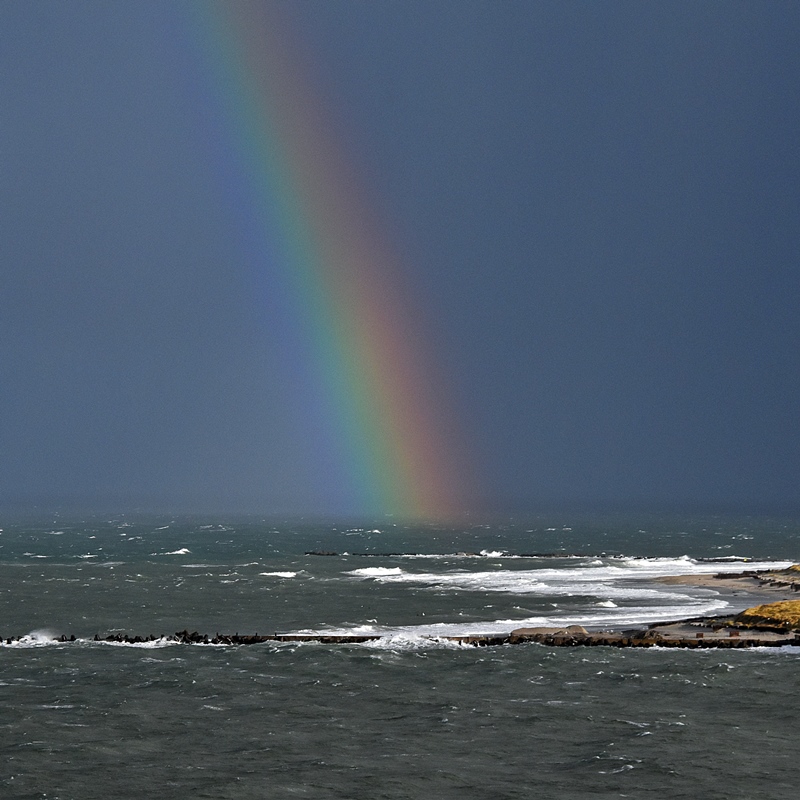 Hinter der Helgoländer Düne bildet sich ein Stück Regenbogen. Gebt auf Euch acht und . . . Gruß von der Insel