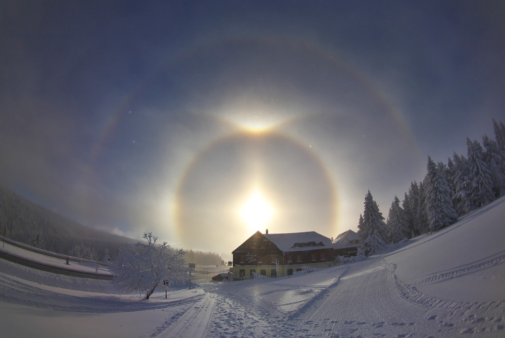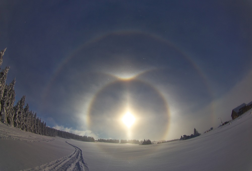 Über die Bergkuppen hatte sich eine Eiskappe gelegt und die höher gelegenen Wolken sanken auf etwa 1000 Meter ab. Auch musste der (kaum vorhandene) Wind auf Süd gedreht haben (automatische Windmessung seit Wochen defekt), denn vom inzwischen entstandenen Nebelmeer flossen die Wolken über die Grenze und zerfielen in Eiskristalle. Und so gab es in einem kleinen Gebiet zwischen Neklid und der Sachsenbaude die suchtstillenden Objekte mit herrlichen 3D-Effekten vor allem bei Untersonne und oberen Berührungsbogen.