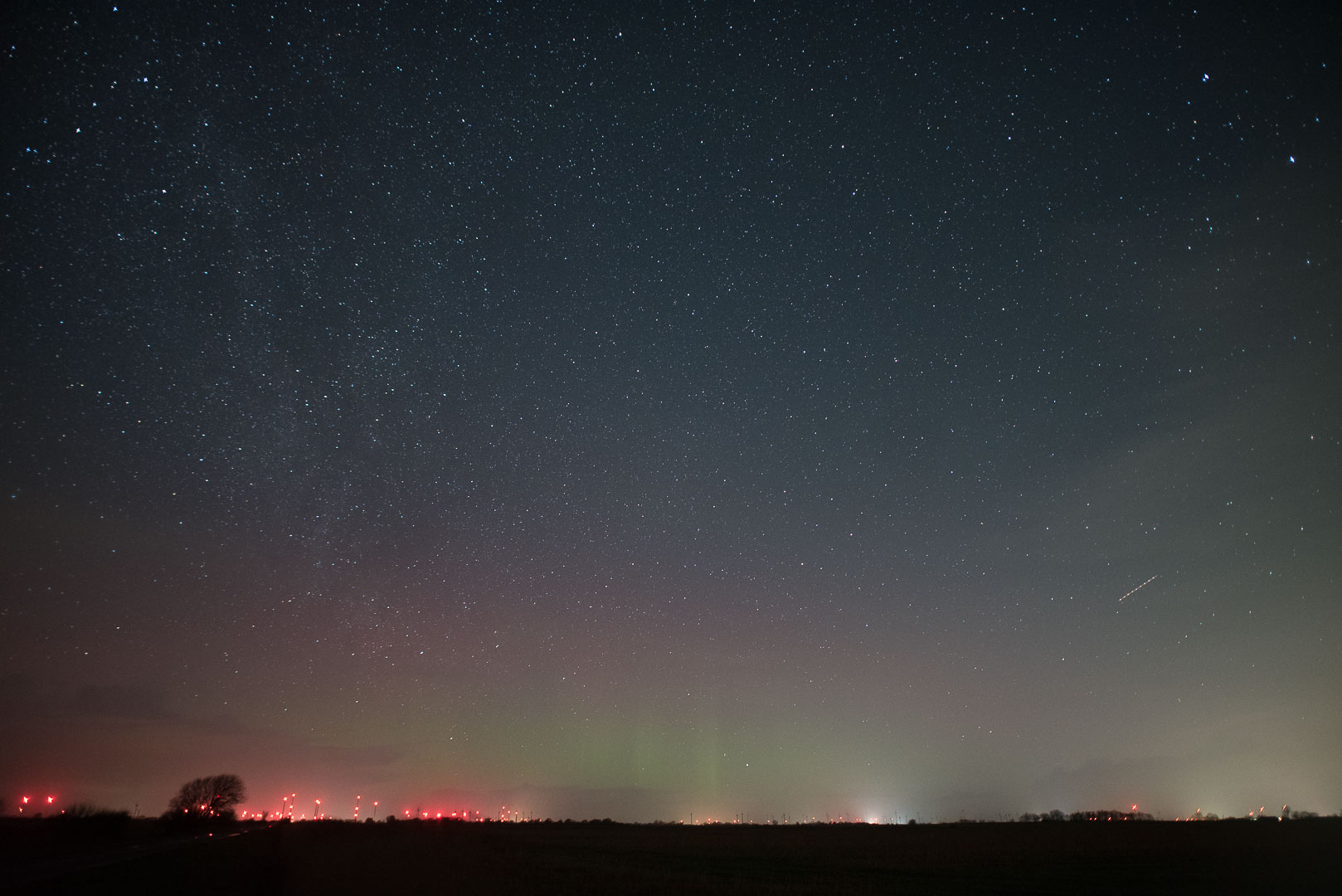 Was die Lichtverschmutzung tatsächlich ausmacht ist auch im direkten Vergleich der beiden nachfolgenden (mit gleichen Einstellungen aufgenommenen und entwickelten) Bilder sichtbar, denn zwischenzeitlich war einiges an Licht aus den Häusern weggefallen, das Bild dadurch dunkler und das rote Polarlicht deutlich besser erkennbar (ggfs. natürlich auch stärker).