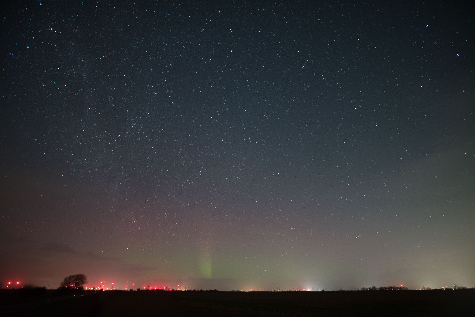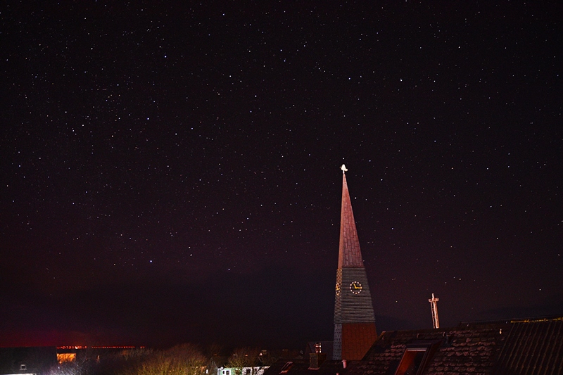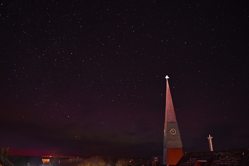 Was die Lichtverschmutzung tatsächlich ausmacht ist auch im direkten Vergleich der beiden nachfolgenden (mit gleichen Einstellungen aufgenommenen und entwickelten) Bilder sichtbar, denn zwischenzeitlich war einiges an Licht aus den Häusern weggefallen, das Bild dadurch dunkler und das rote Polarlicht deutlich besser erkennbar (ggfs. natürlich auch stärker).