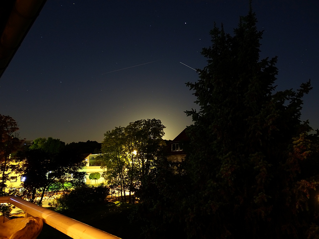 den ISS-Ultramarathon in der Nacht 13./14.05.2022 habe ich erfolgreich absolviert, alle 5 Überflüge wurden gesehen. Beim ersten und schwierigsten kam die Station allerdings nur für etwa 3 Sekunden über das Dach auf der anderen Straßenseite hinaus. Ein Foto gibt es daher nicht. Von den anderen 4 Überflügen habe ich Bilder, eines wenig eindrucksvoll, zwei weitere leicht unscharf, sodass ich hier nur ein Foto des letzten Überflugs zeige.