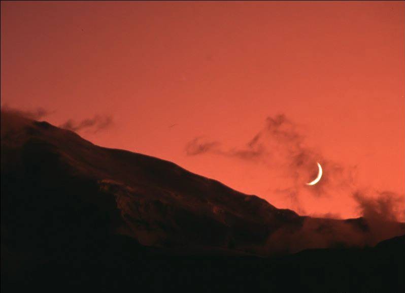 Nach dem Pinatubo-Ausbruch im Juli 1991 hat es über ein Jahr lang ungewöhnliche Dämmerungen gegeben. Hier mal ein Bild von Wolfgang, aufgenommen im November 1991 in Nepal.