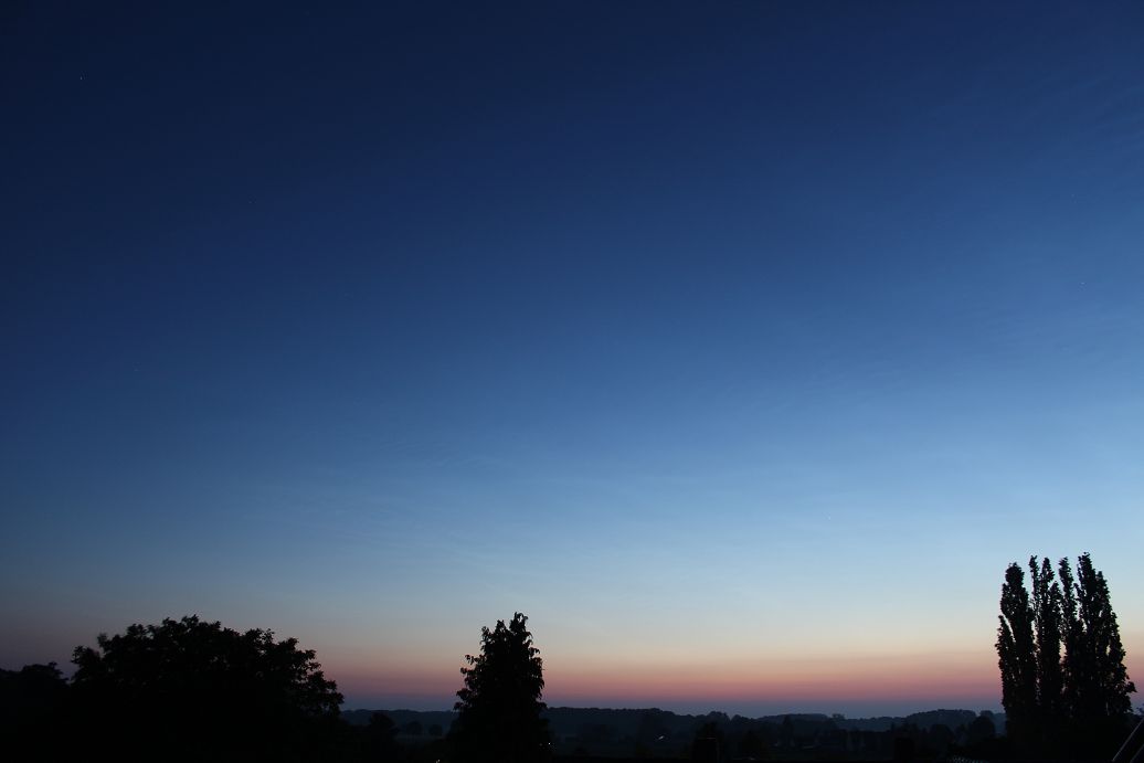 Tja, der abendliche Blick gen Himmel, auf der Südseite vom Wiehengebirge, war geprägt von dem Gedanken, dass ich ja beruhigt schlafen gehen könnte. Schließlich zierten allerhand troposphärische Wolken das Himmelsbild. Meine Dachkamera im Netzwerkbetrieb, positioniert bei Lübbecke und entsprechend auf der Nordseite vom Wiehengebirge, zeigte mir dann ab ca. 2 Uhr (MESZ) Anzeichen für ein überraschendes NLC-Morgendisplay. Mittlerweile war der Himmel frei von Wolken. Diese ersten zarten NLC-Strukturen wandelten sich ab etwa 02:30 MESZ in ein beeindruckendes Gesamtbild: