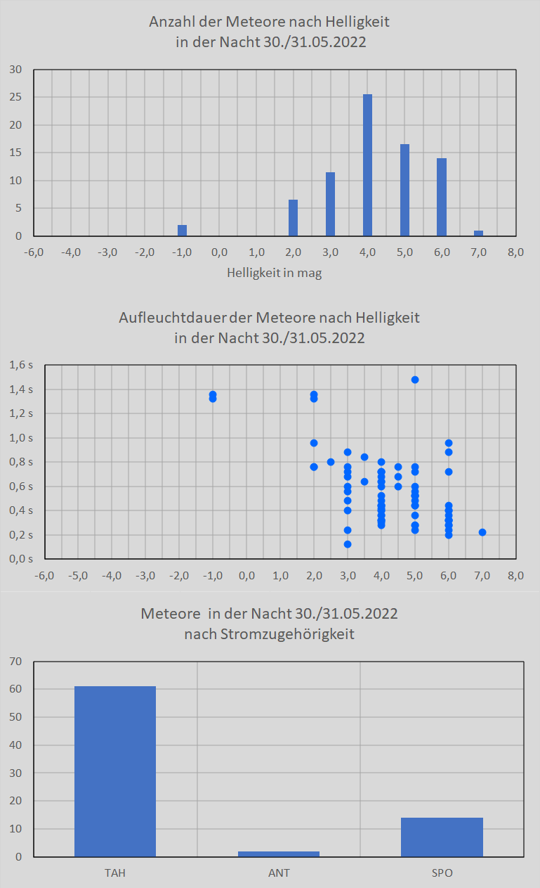Durch die sich überschneidenden Kamerafelder gab es Doppelungen (Strombezeichnung mit "+"). Ohne diese, waren es zusammen 77 Meteore von denen 61 TAH's waren.