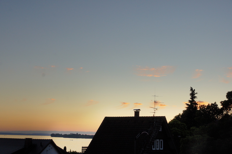 1. die wohl am weitesten entfernte Nebensonne, ich ich je beobachtet habe. Sie war als schmaler Streifen am oberen Rand eines Cirrenschirmes zu erkennen, lediglich der Rotanteil war auszumachen. Die Gewitterwolke muss sich etwa über Mulhouse befunden haben; Entfernung von Nonnenhorn/Lindau ca. 170 km. 2. ein Regenbogen mitten im Abendrot. Auffällig war, dass trotzdem der gelb-grün-Anteil noch vorhanden und erkennbar war. Ferner zeichnete sich zumindest Stellenweise eine Interferenz ab! Sonnenuntergang für Nonnenhorn: 21:15 MESZ, letztes Erhaschen des Regenbogens: 21:20 MESZ