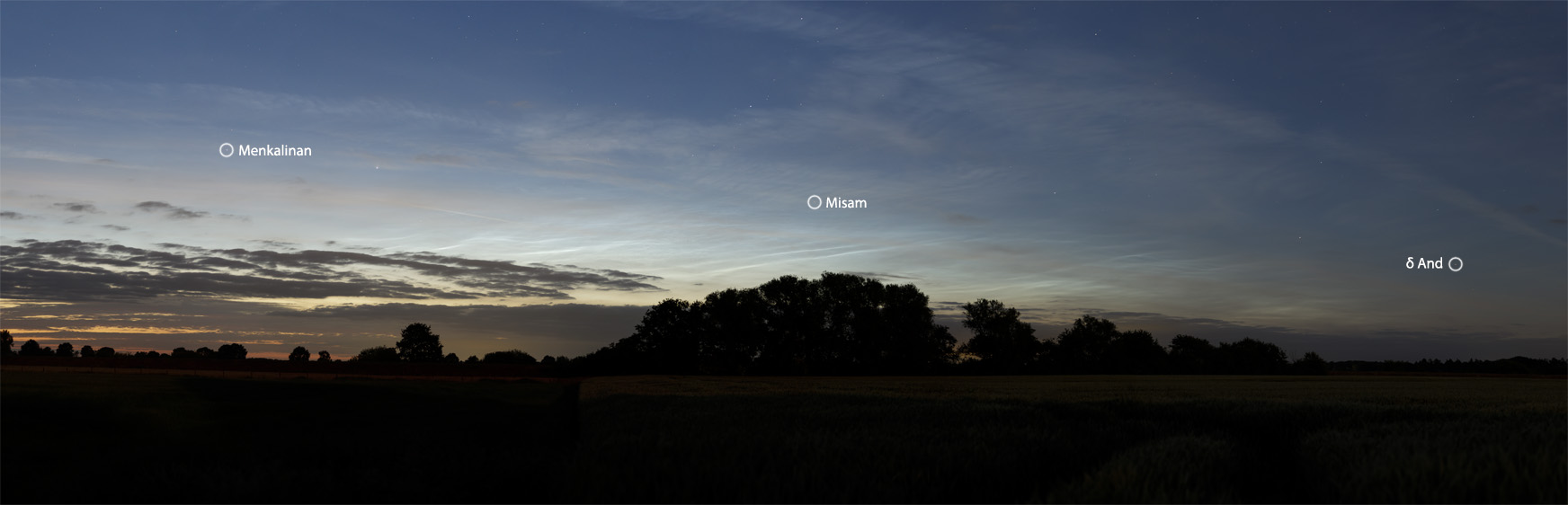 An meinem Standort (Quernheim/Lübbecke) hat es sich um das erste Allnight-Display der Saison gehandelt. Die Leuchtenden Nachtwolken waren die gesamte Nacht hindurch sichtbar. Niedrigster Sonnenstand in dieser Nacht: -14,5°. Nach raschem Verblassen zu 1 Uhr (MESZ), rapide Helligkeitszunahme rund um 01:15 MESZ, noch vor der astronomischen Mitternacht.