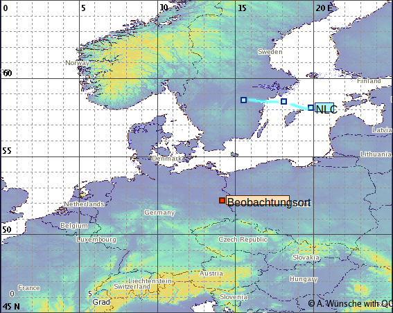 In den Bildern der DWD-Kamera Lindenberg sind die NLCs im Zeitraum 23:40MESZ bis 1:10MESZ erkennbar, haben sich entwickelt und verfielen, blieben dabei mehr oder weniger an Ort und Stelle.