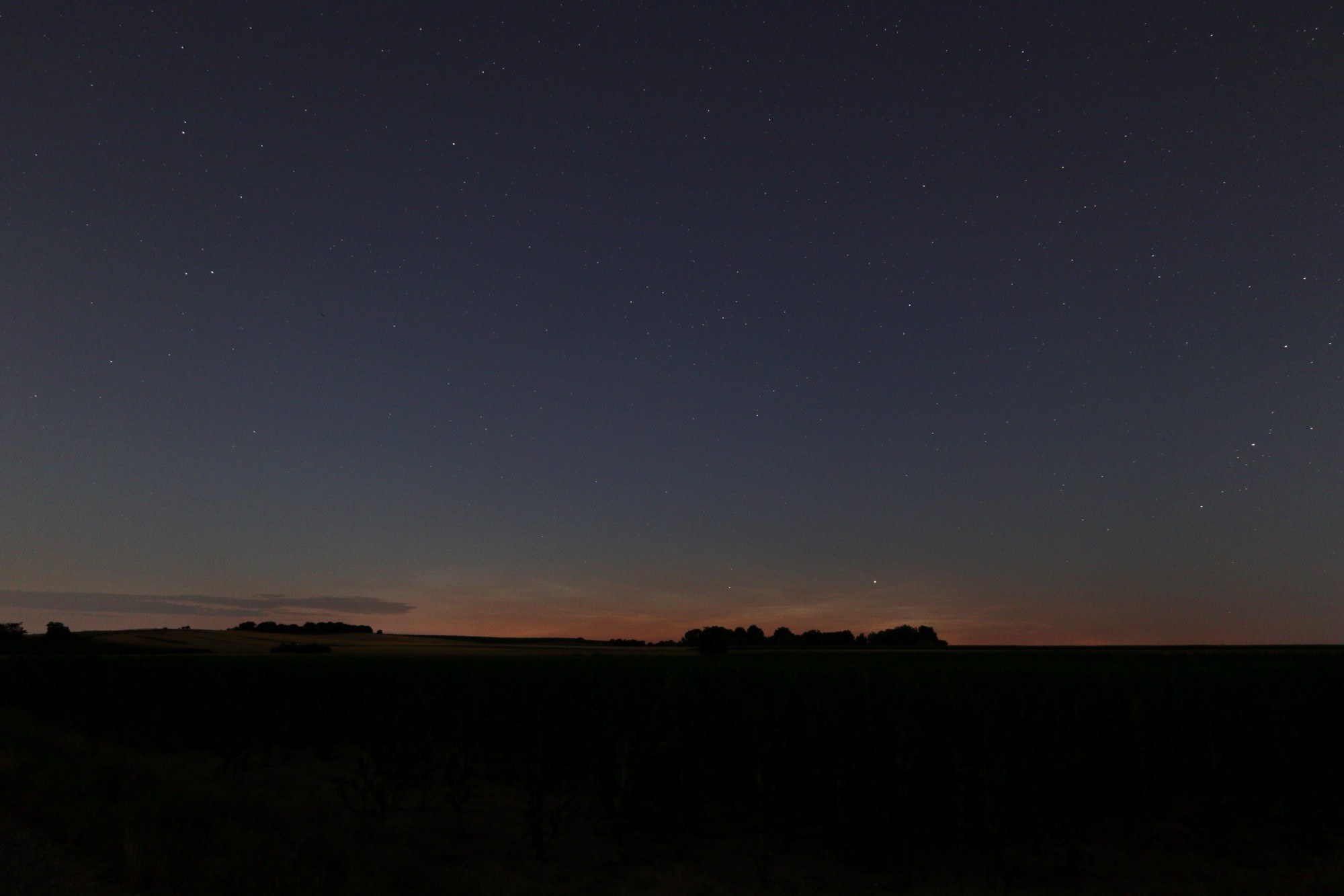 Ich hatte gegen 22:40 im NNO ein Feld gesehen, mit stark ausgeprägten Rippeln, ungefähr 10° hoch, das aber sehr schnell verblasste. Später in Horizontnähe kleine Fetzen von NLCs zu erahnen, das Gerät oben links habe ich garnicht wahrgenommen. Dafür habe ich auf eine 85mm-Linse umgesattelt die ich mir geliehen habe. Gefällt mir gut, ein Zeiss Batis, es ist auch ciel einfacher ein hünsches Setting zu finden und abzulichten.