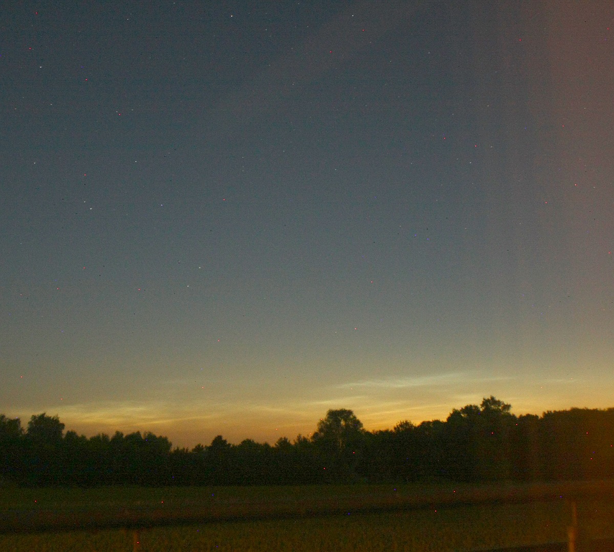 Von mir auch ein erstes Belegfoto aus der zweiten Nachthälfte. Leider war der Nordhorizont, wie befürchtet, bereits sehr stark eingetrübt, so dass feine Details auf meiner Aufnahme zumindest in der komprimierten Variante mit geringer Auflösung nicht mehr zu erkennen sind. Im Vergleich zu meiner vorherigen NLC-Nacht waren die äußeren Bedingungen diesmal auch komplett andere. Während ich Sonntag früh noch bei Temperaturen bis 7°C fröstelte, reichten diesmal bereits kurze Hosen aus.