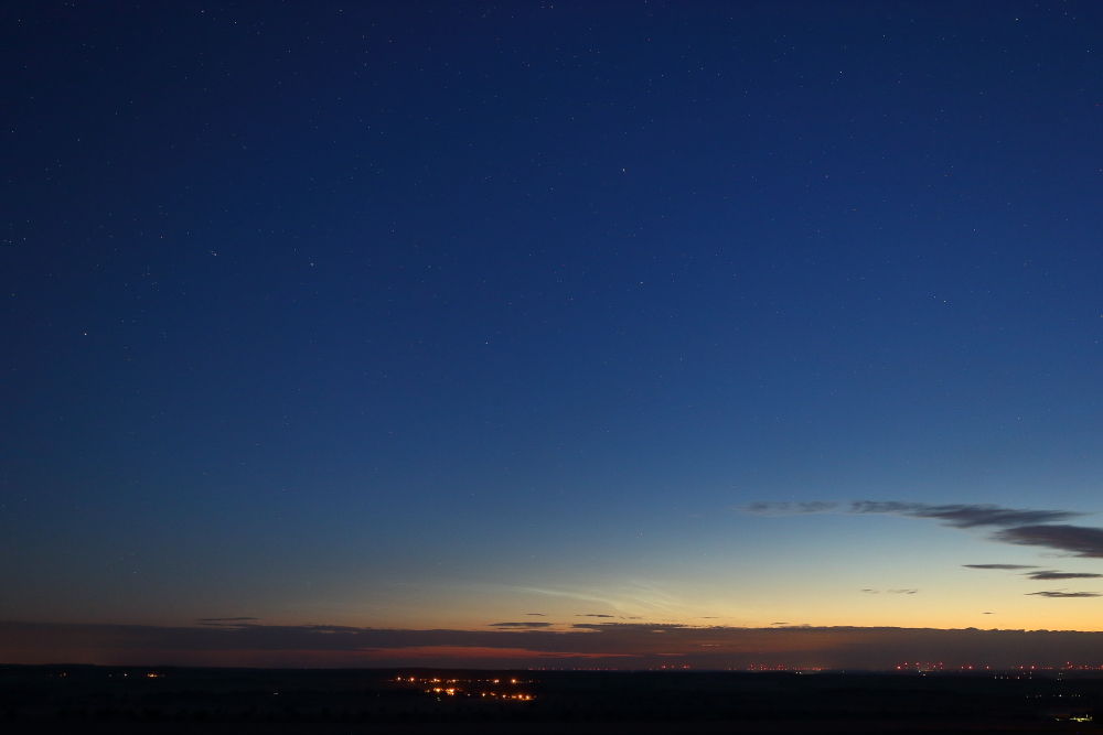 Auch von mir noch ein Belegfoto meiner Observation aus dem Morgensektor vom Liebschützberg, die aufgrund der vielversprechenden Werte am DSCOVR vorrangig auf fotografisches Polarlicht ausgelegt war. Allerdings gab es auch für diesen sehr späten Zeitpunkt der Saison eine ganze Reihe an NLC-begünstigenden Faktoren (NLC-Häufigkeit im D-A-CH - Gebiet in den letzten Tagen, letzte Daisies, aktuelle MLS-Daten von Kühlungsborn & ALOMAR, Aktivität an den nördlichen Radarstationen, Werte der Windmesser in Juliusruh), aufgrund derer ich mir in ihrer Kombination im Morgensektor recht gute Chancen einräumte. Die unscheinbaren und durch den Blick durchs mitgeführte 8x30 Fernglas weitaus attraktiver wirkenden NLCs vom Typ "Elvis"