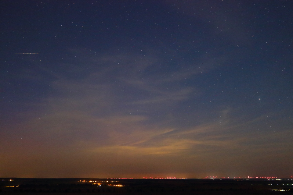 Um die Transparenz war es wahrlich nicht gut bestellt. In einer Melange aus Dunst und immer wieder durchziehendem troposphärischen Gewölk ging das Meiste vom Polarlicht wie hinter einem Schleier leider mehr oder weniger unter. Schade! Beamer hätte ich zwar auch so einige im Angebot. Aber ansehnlich ist was anderes. Am deutlichsten trat das Polarlicht (rein fotografisch) an meinem Standort noch kurz nach 22:00 MESZ in Erscheinung, wobei mit Blick auf die anderen Nachweise eine Ausrichtung mehr gen NNW (oder mehr Weitwinkel) diesmal wohl noch mehr zutage gefördert hätte. Nachfolgend 5 Aufnahmen: