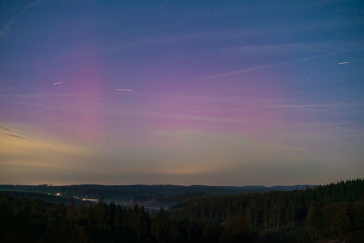 gegen 21:00 Uhr habe ich mich auf den Weg gemacht - und zunächst gar nichts gesehen. Ein leichter Grünstich im Dunst sah schon auf dem Kameradisplay falsch aus und lässt sich am PC-Monitor nicht bestätigen.