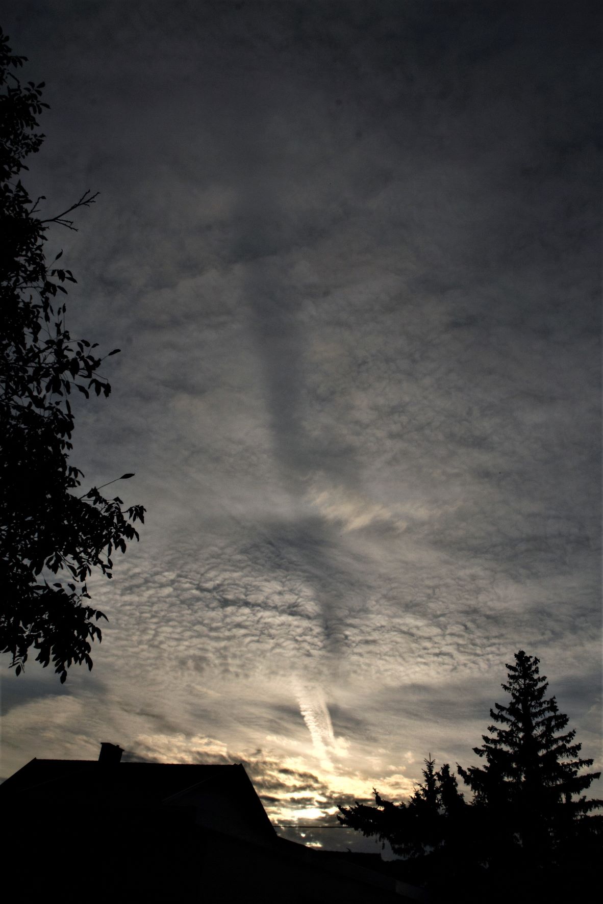 Heute Morgen bei Sonnenaufgang im Osten. Die Flieger müssen wohl alle vom Flughafen Bratislava gestartet sein, deren Kondensstreifen in der Höhenströmung - die noch kräftig sein muss, so total zerzaust werden.