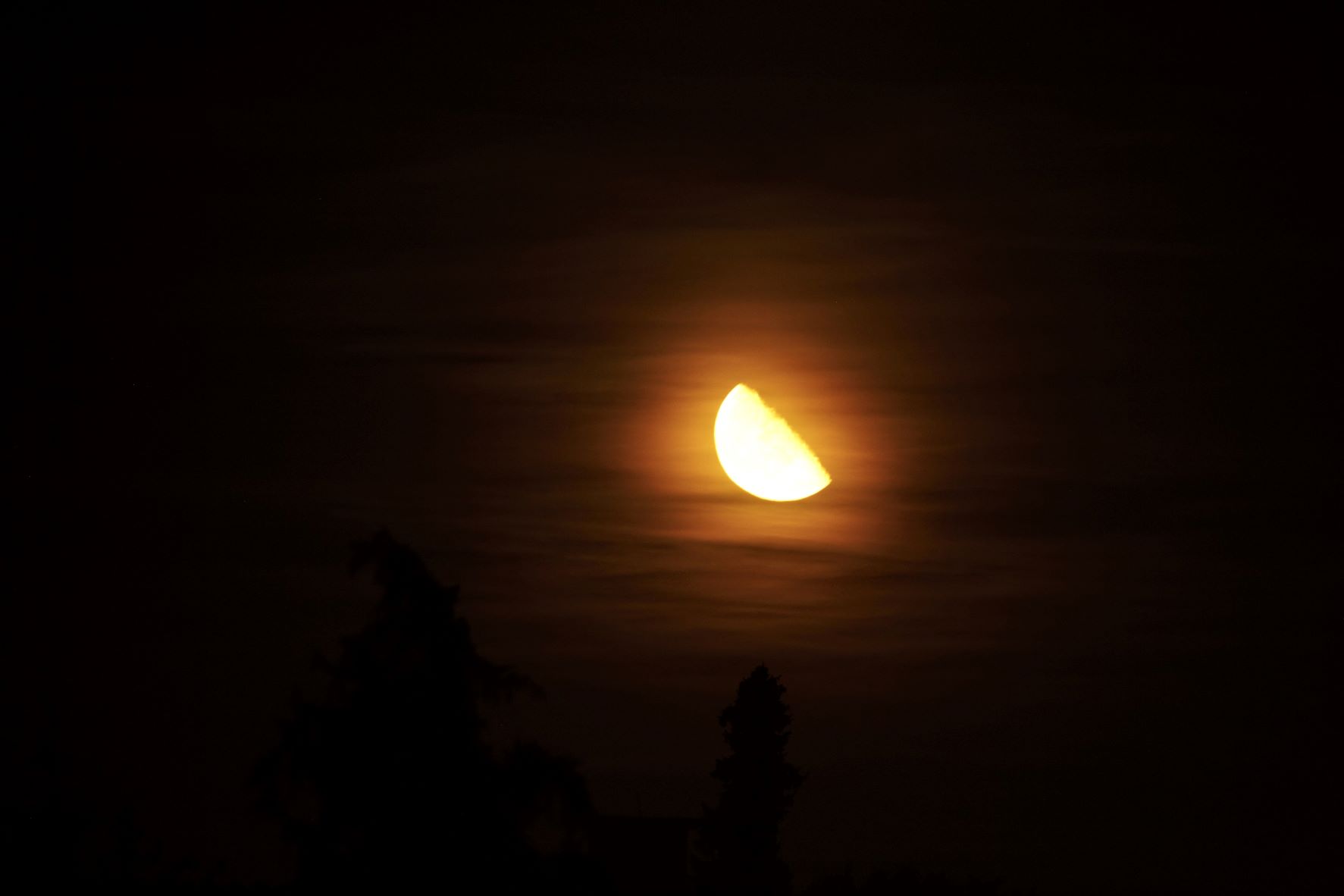 der im Osten aufgehende abnehmende Mond durch eine dichte Dunstschicht gestern Nacht