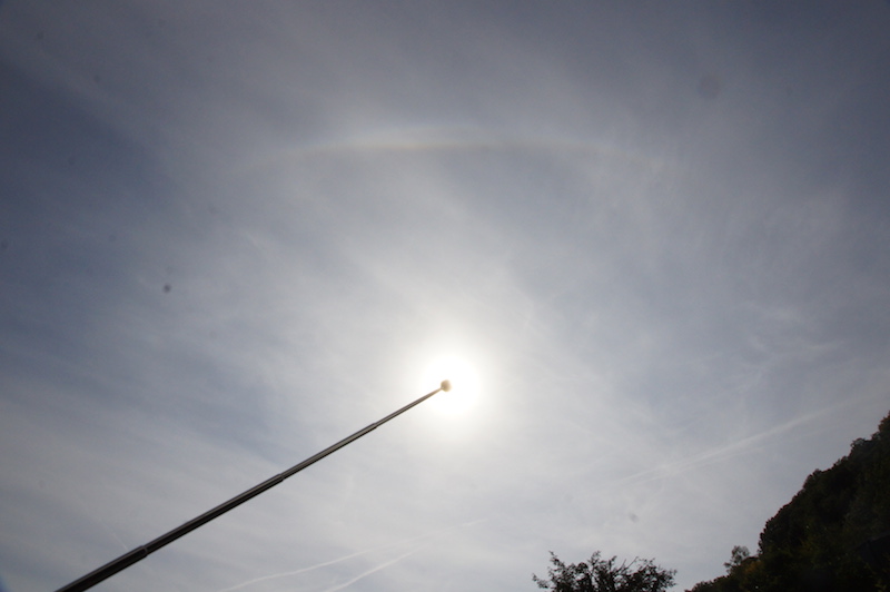 Ich meine die Auffhellung auf gleicher Bildhöhe, links von der offensichtlichen Nebensonne auf quasi halbem Weg zum unscharfen Linsenfleck im Bild.