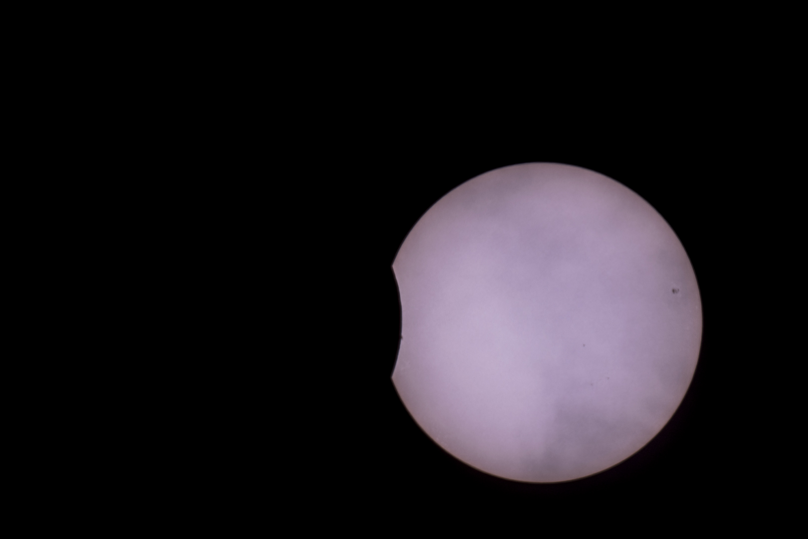 Wie an vielen anderen Orten war auch bei mir in Norddeutschland der Himmel lange komplett bedeckt. Erst kurz vor Maximum war die Sonne als undeutlicher Fleck durch die Wolken hindurch sichtbar. Erst kurz nach Maximum gelang dann die erste Sichtung und das erste Bild, wobei die Fokussierung wegen der weiterhin durchziehenden Wolken nicht gut war. Zum Ende hin waren nur noch dünne Schleier und Dunst über. Komplett klar war der Himmel nie.