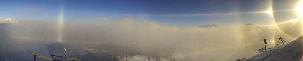 Der Halobereich unmittelbar links der Sonne entspricht genau der Anordnung der Einzelerscheinungen des großen Phänomens, das Hermann Scheer am 18. Oktober 2010 am Rauriser Sonnblick dokumentiert hat. https://www.bergratz.at/halo-okt-2010/