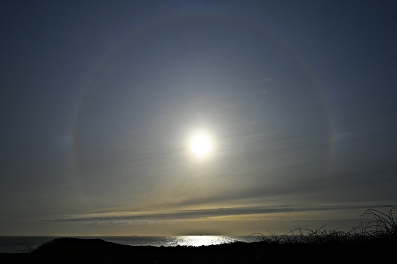 Dank Alex erhielt ich über 2 m Amateurfunk die Meldung von einem kräftigen 22er bei ihm. 2 Stunden danach waren die Cirren auch bei mir in Freital angekommen. Ich hatte zwar die Kamera mit (wegen evtl. Regenbögen am Nachmittag oder Abend), aber nicht das Fisheye…Der Ring war recht kräftig. Anbei hier noch in schwächerer Form…