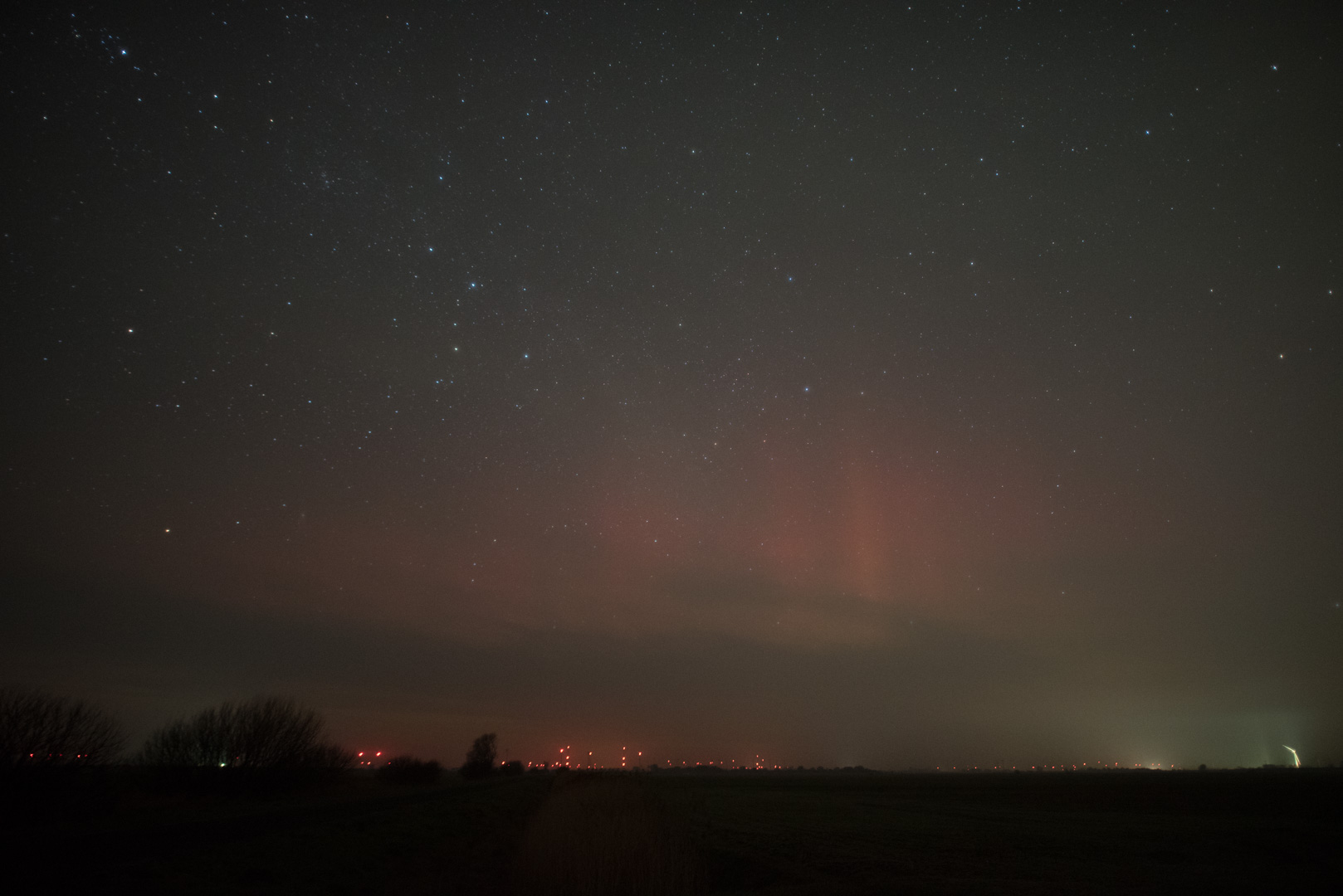 Mit schlechter werdenden Werten am DSCOVR und Nachweisen an den Amrum-Webcams bin ich dann doch noch rausgefahren. Gleich das erste Bild lieferte einen eindeutigen Nachweis. Die Kamera war hier meinen Augen absolut überlegen. Im Norden war aus meiner Sicht alles bedeckt. In den nächsten Minuten besserte sich die Sicht aber und um 22:50 UTC glaubte ich sogar eine rötliche Tönung knapp unter Cassiopeia wahrzunehmen. Beim Blick auf das Kamera-Display war das kreischende Pink nicht zu übersehen. Bis 23:30 UTC ließ die Aktivität deutlich nach zumal eine durchziehende Wolkenbank die Sicht beeinträchtigte. Bis zum Ende meiner Beobachtung ist aber immer noch ganz schwach fotografisches PL zu sehen.