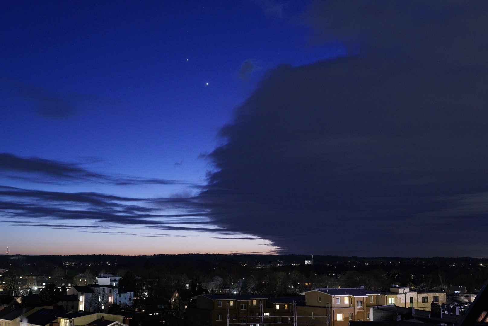 Am 27. Februar konnte ich Venus und Jupiter gerade noch direkt neben einem Wolkenmonster ablichten, danach waren sie verschwunden.