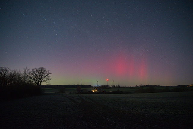 Kommentar: Bereits beim ersten Foto gegen 01:00 Uhr MEZ zeigten sich auf dem Kameradisplay leichte rötliche Färbungen in Horizontnähe. 5 Minuten später wurden die Farben deutlich intensiver auf dem Monitor. Und für ein paar Sekunden konnte ich dann einen schwachen Beamer erkennen.... Die Nacht war sternenklar ‼