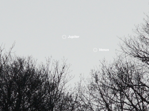 Am Mi. 1.3. hatte ich mich daher darauf beschränkt, Venus mit dem 12x60-Fernglas aufzusuchen und Jupiter zu finden. Venus zu finden war dann doch überraschend einfach (ich konnte sie sogar mehrfach wiederfinden; 13:30 MEZ). Viel schwieriger war dagegen das Auffinden von Jupiter, das mit dieser Vergrößerung als sehr blasses Scheibchen erscheint. Als ich aufgeben wollte, hatte ich ihn endlich erwischt! Die Schwierigkeit bestand v.a. darin, den richtigen Abstand zu Venus zu finden!) Später (15:20 MEZ) konnte ich das Paar nochmals sehen und wollte es dann beim "Untergang" hinter dem Berg noch ein letztes Mal versuchen (17:30–17:43 MEZ). Das glückte, und zu meiner großen Überraschung konnte ich Jupiter tatsächlich mit bloßem Auge erfassen. Der Himmel war zu dieser Zeit schon etwas klarer geworden, aber das Entscheidende war die Konstellation: Das Planetenpaar verschwand hinter den laublosen Bäumen am Hang, vielleicht 50m von mir entfernt (Höhe: 30°; Azimut: 237°). Bei dieser Entfernung spielte die Parallaxe (zwischen BA und Fernglas) keine Rolle mehr; das Auge war zudem auf "unendlich" eingestellt, und die Zweige halfen dabei, den Ort des Jupiter genau zu fixieren. So konnte ich ihn klar erkennen – unter Bedingungen, die es ohne diese "Hilfe" schlicht unmöglich gemacht hätten. Selbst auf Fotos ist es mir gelungen, den Jupiter zu erwischen (er ist längst nicht auf allen Bildern drauf!).