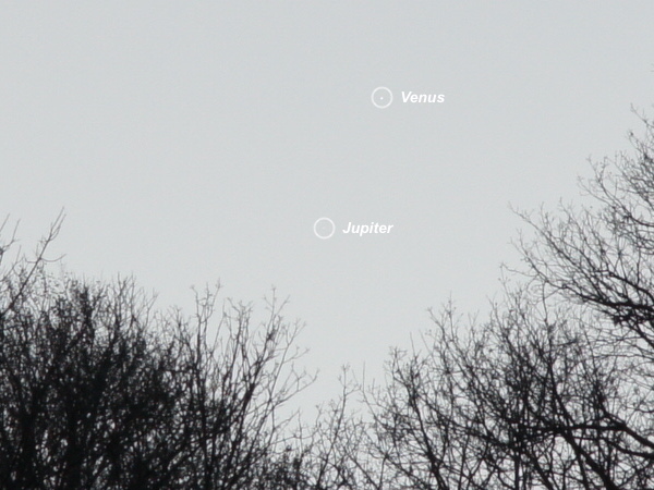 Am Mi. 1.3. hatte ich mich daher darauf beschränkt, Venus mit dem 12x60-Fernglas aufzusuchen und Jupiter zu finden. Venus zu finden war dann doch überraschend einfach (ich konnte sie sogar mehrfach wiederfinden; 13:30 MEZ). Viel schwieriger war dagegen das Auffinden von Jupiter, das mit dieser Vergrößerung als sehr blasses Scheibchen erscheint. Als ich aufgeben wollte, hatte ich ihn endlich erwischt! Die Schwierigkeit bestand v.a. darin, den richtigen Abstand zu Venus zu finden!) Später (15:20 MEZ) konnte ich das Paar nochmals sehen und wollte es dann beim "Untergang" hinter dem Berg noch ein letztes Mal versuchen (17:30–17:43 MEZ). Das glückte, und zu meiner großen Überraschung konnte ich Jupiter tatsächlich mit bloßem Auge erfassen. Der Himmel war zu dieser Zeit schon etwas klarer geworden, aber das Entscheidende war die Konstellation: Das Planetenpaar verschwand hinter den laublosen Bäumen am Hang, vielleicht 50m von mir entfernt (Höhe: 30°; Azimut: 237°). Bei dieser Entfernung spielte die Parallaxe (zwischen BA und Fernglas) keine Rolle mehr; das Auge war zudem auf "unendlich" eingestellt, und die Zweige halfen dabei, den Ort des Jupiter genau zu fixieren. So konnte ich ihn klar erkennen – unter Bedingungen, die es ohne diese "Hilfe" schlicht unmöglich gemacht hätten. Selbst auf Fotos ist es mir gelungen, den Jupiter zu erwischen (er ist längst nicht auf allen Bildern drauf!).