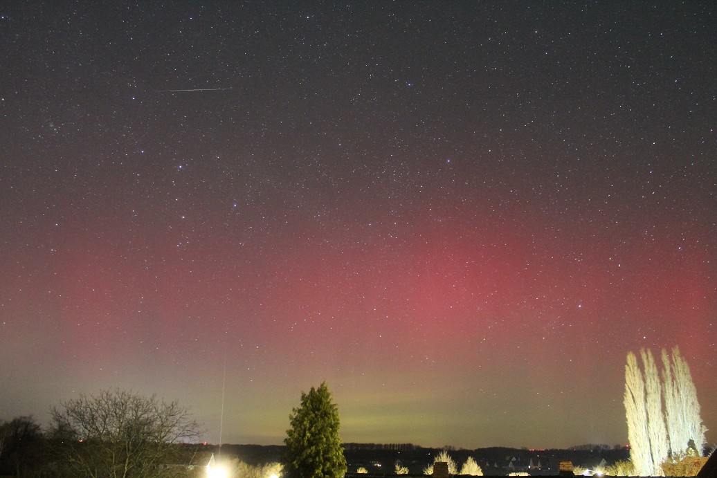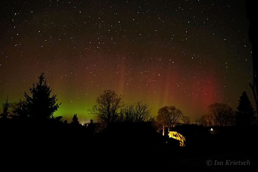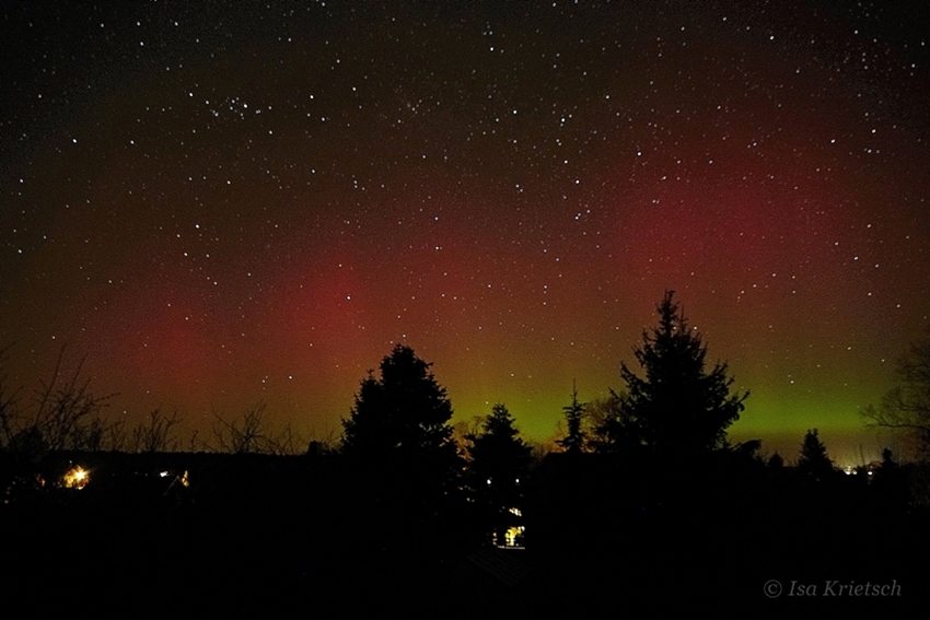 Erscheinungsbild: Fotografisches rotes Polarlicht und bis min. 23:30 (MEZ) langsam gen NNO wandernde Beamer. Später (fotografisch dokumentiert) hochreichendes, rotes Polarlicht mit Beamern, horizontnah darunter diffuses grünes Polarlicht.