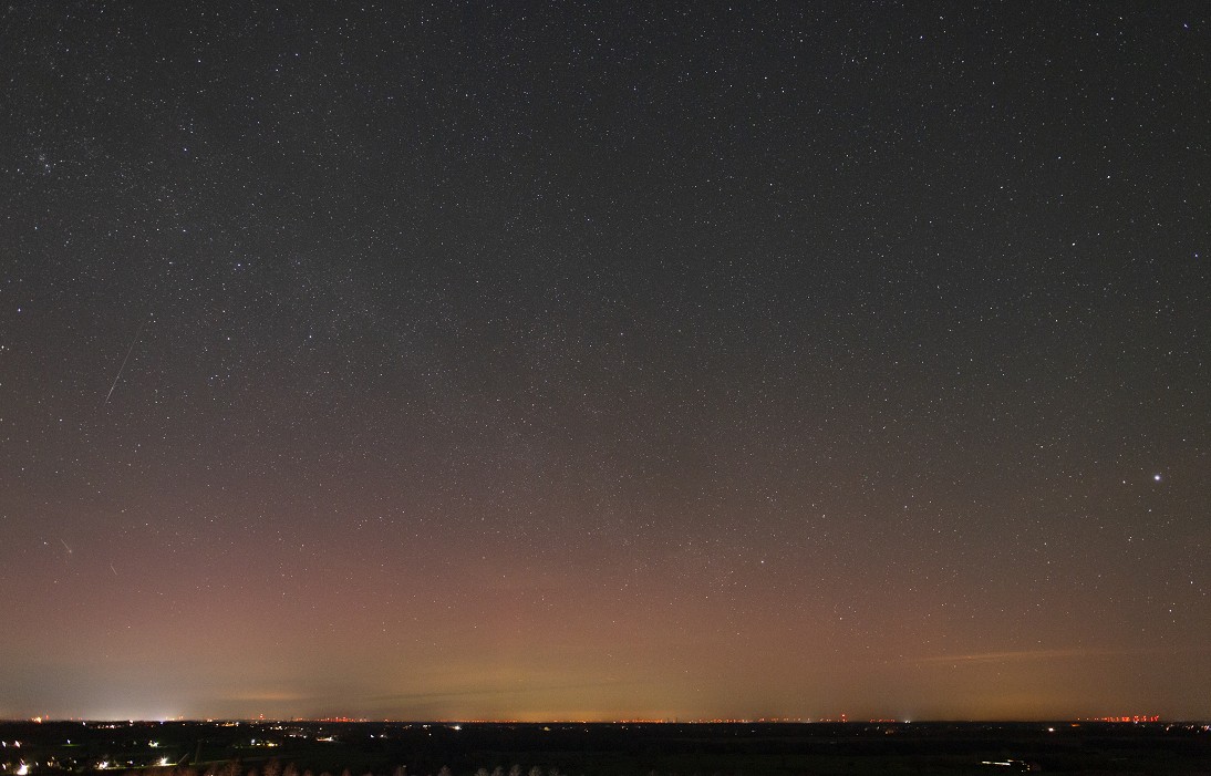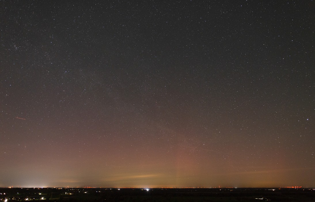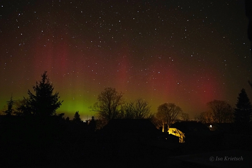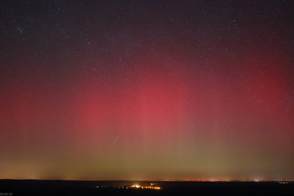 Erscheinungsbild: Fotografisches rotes Polarlicht und bis min. 23:30 (MEZ) langsam gen NNO wandernde Beamer. Später (fotografisch dokumentiert) hochreichendes, rotes Polarlicht mit Beamern, horizontnah darunter diffuses grünes Polarlicht.