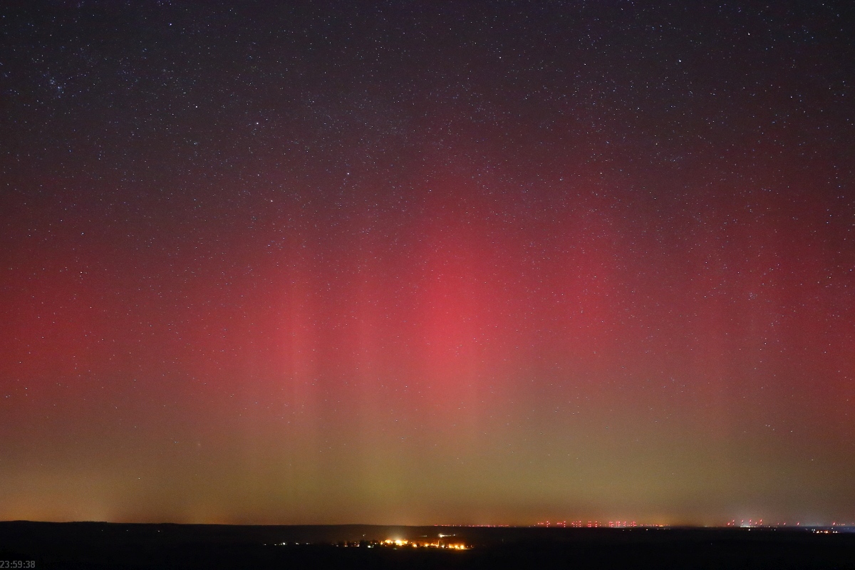 Erscheinungsbild: Fotografisches rotes Polarlicht und bis min. 23:30 (MEZ) langsam gen NNO wandernde Beamer. Später (fotografisch dokumentiert) hochreichendes, rotes Polarlicht mit Beamern, horizontnah darunter diffuses grünes Polarlicht.