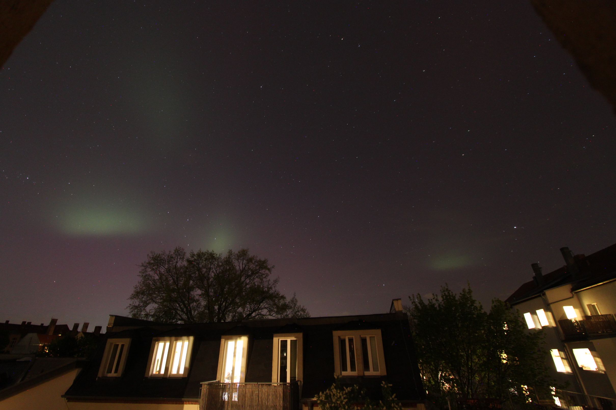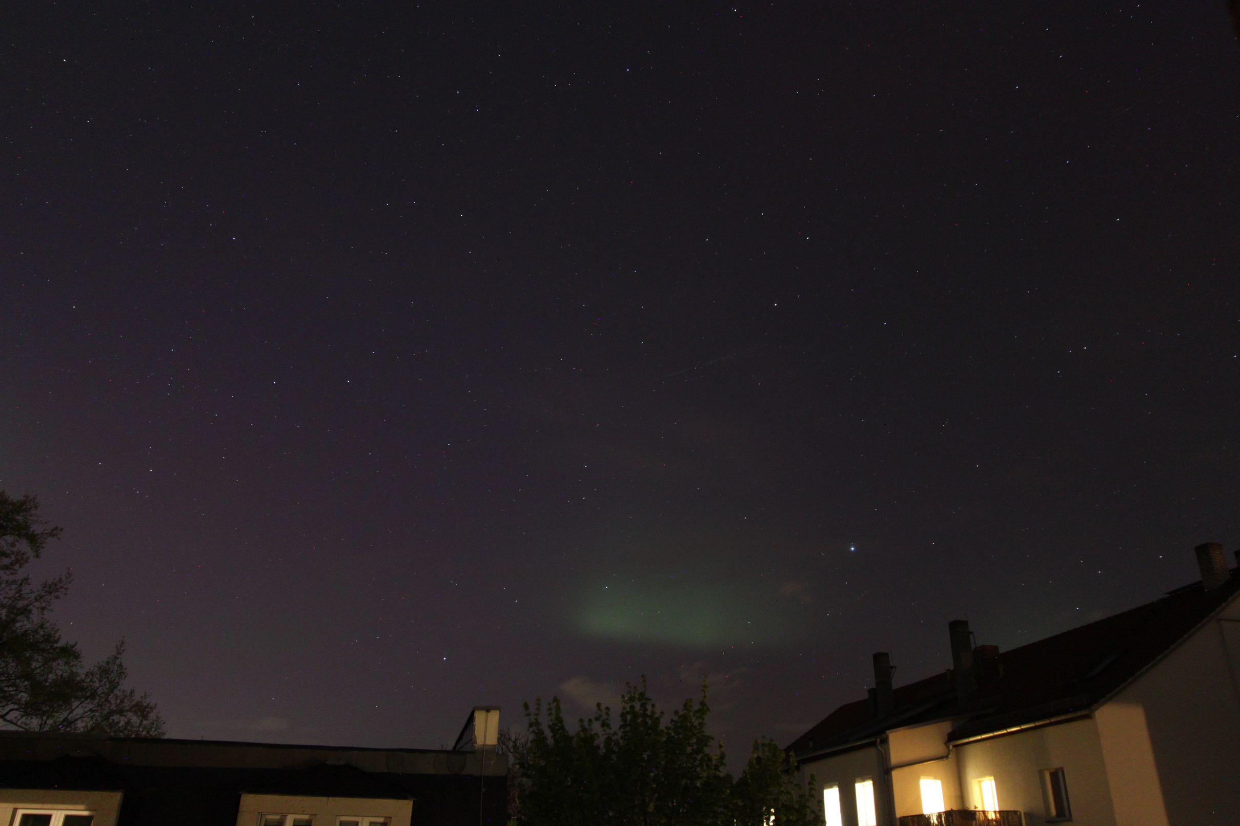 Hier ein paar unbearbeitete Bilder aus der Dresdner Innenstadt zwischen 22:05 und 22:20 MESZ. 10mm, t=5s, f4.0, ISO 800. Trotz Lichtsmog war das PL deutlich visuell, mit pulsierenden Helligkeitsveränderungen. Herrlich! Ein Hauch von Tromsø...