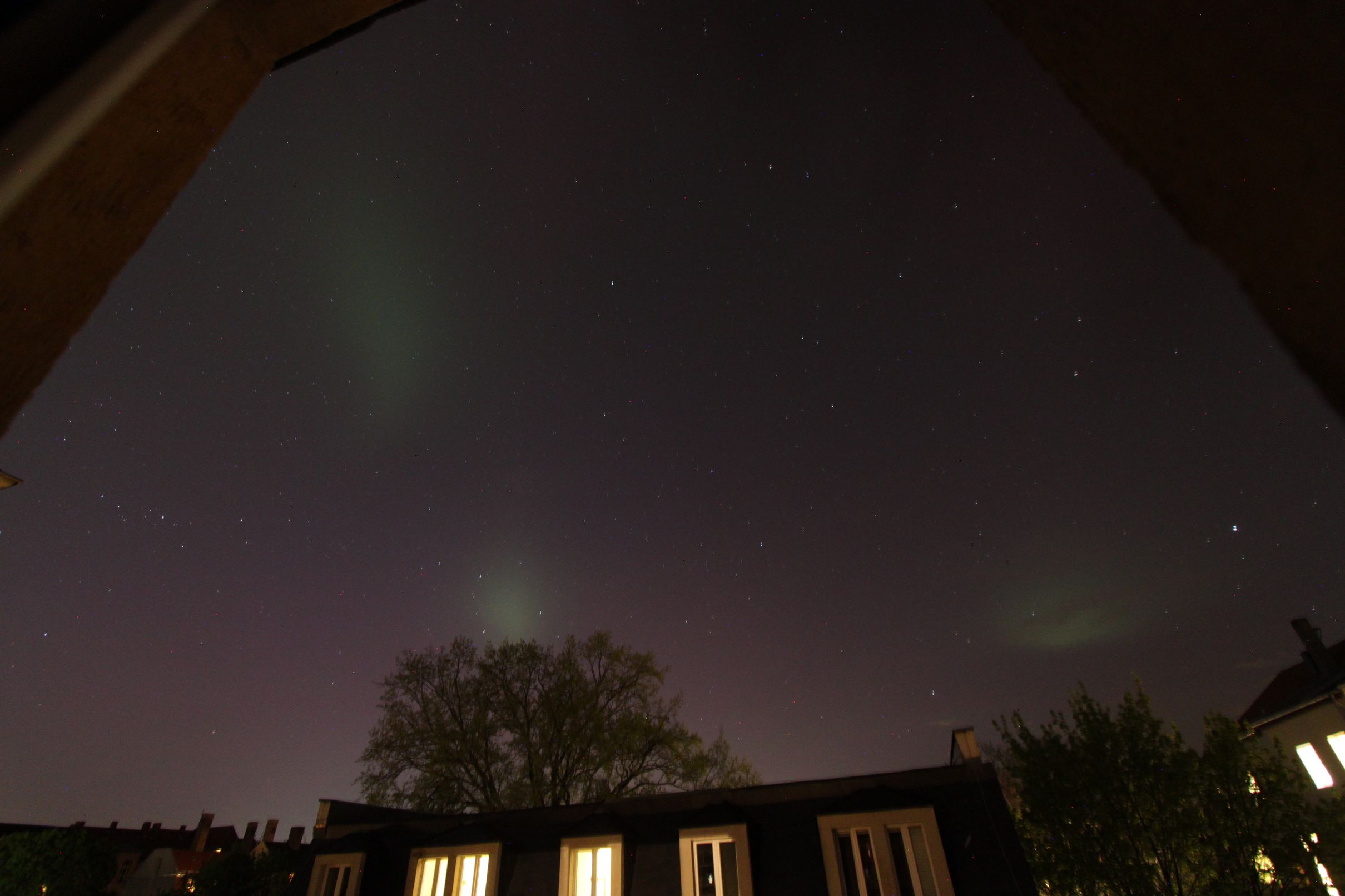 Hier ein paar unbearbeitete Bilder aus der Dresdner Innenstadt zwischen 22:05 und 22:20 MESZ. 10mm, t=5s, f4.0, ISO 800. Trotz Lichtsmog war das PL deutlich visuell, mit pulsierenden Helligkeitsveränderungen. Herrlich! Ein Hauch von Tromsø...