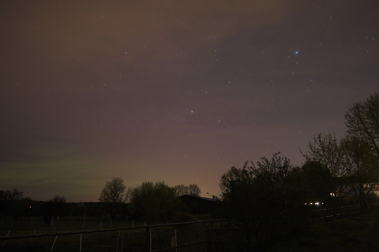 Ich hatte zumindest in der ersten Nachthälfte auch halbwegs Glück mit dem Wetter, brach dann aber frühzeitig ab, da es zuzog, die Luftfeuchtigkeit unangenehm anstieg und ich den letzten Zug zurück dann doch noch ohne Eile bekommen wollte. Das deutlich visuelle Polarlicht war fotografisch bereits auf den ersten Testaufnahmen um 21:28 MESZ bis zum Ende der Observation um 23:25 MESZ nachweisbar. Das Gebotene stiftete reichlich Verwirrung und sorgte für eine gehörige Reizüberflutung bei mir. Ich wusste zeitweise gar nicht mehr, wo ich denn hinschauen sollte. Das Highlight waren sicher die gut sichtbaren wandernden und in der Intensität mal zunehmend und dann wieder abflauenden grünen Flecken (zumeist 3), die ich visuell farblich allerdings nicht zuordnen konnte. Bemerkenswert neben der Höhe, zeitweise war Polarlicht südlich des Zenits sichtbar, war auch dessen frühe Nachweisbarkeit. Hier noch 6 Nachweise von mir: