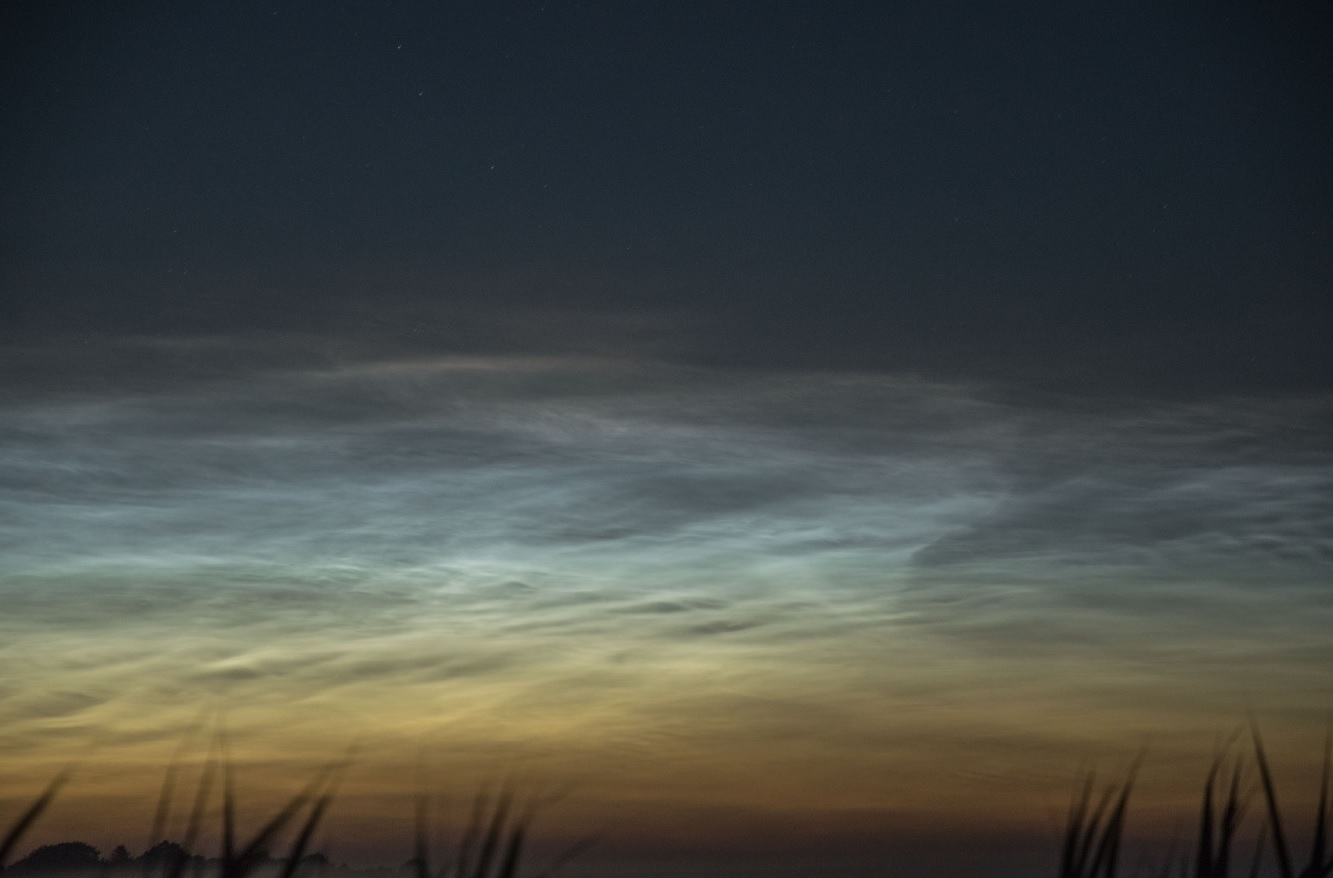 Nach einem spontanen Start auf einem Feldweg in der Nachbarschaft, Ankunft um etwa 23:20 Uhr (MESZ), konnte ich direkt die ersten NLCs erkennen (Helligkeit 1), welche mir zuvor bereits auf meinen Dachkamera-Bildern aufgefallen waren. Es folgt eine Aufnahme von einem etwas späteren Zeitpunkt, zu dem die NLCs eine Helligkeit “3” erreicht hatten und sich bereits in einem sehr warmen Licht präsentierten: