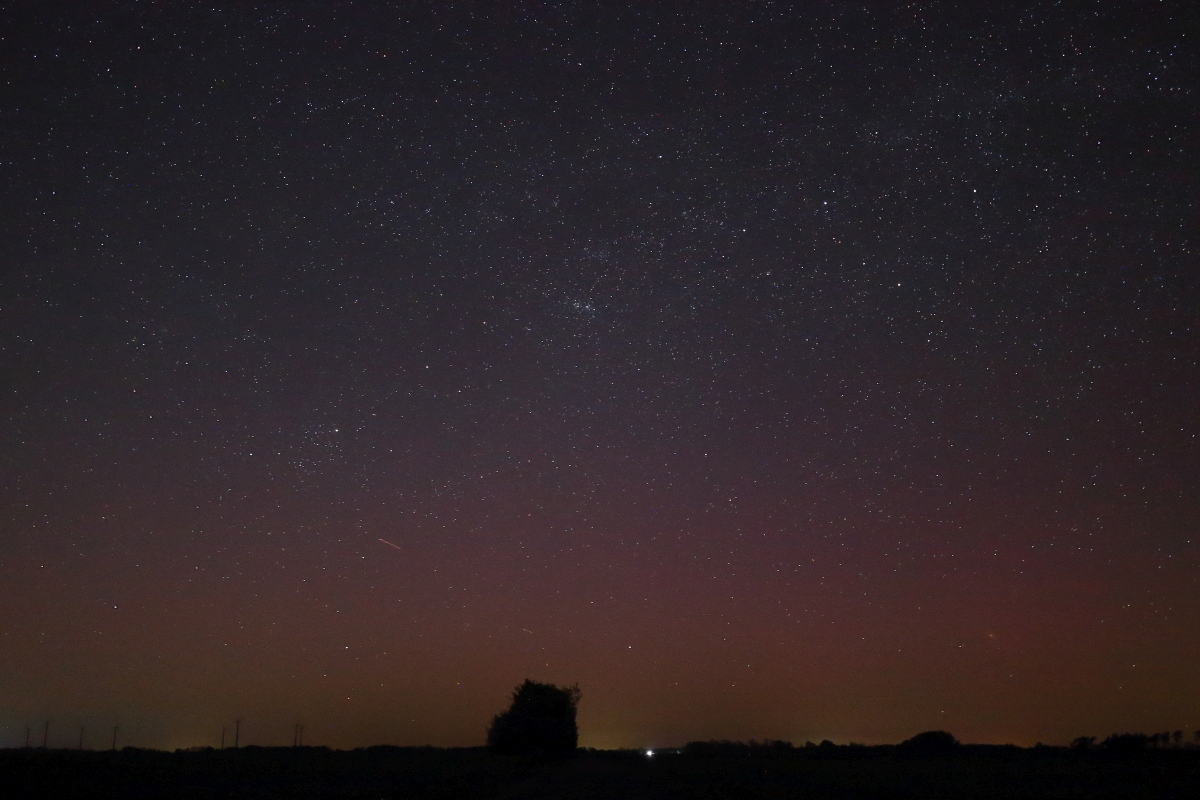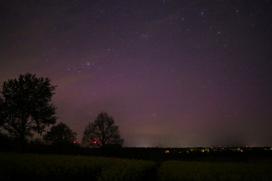 So gute Bedingungen wie vergangene Nacht hatte ich lange nicht mehr. Der Wind war zwar recht ruppg, die Luft dafür ausgesprochen trocken. Unter einem klaren Sternenhimmel war es zwischen den Dörfern zumindest bis zum Mondaufgang zeitweise so dunkel, dass ich ohne Lampe den Boden nicht erkennen konnte. Das kannte ich so schon gar nicht mehr. Letztlich war ich dann auch mehr damit beschäftigt, am Firmanent Sterne, Meteore, Satelliten und die 3 ISS-Überflüge zu beobachten, als mich dem Polarlicht zu widmen. Der Nachweis erfolgt(e) daher ausschließlich fotografisch. Wenn ich mich nicht hätte ablenken lassen, wäre visuell vermutlich auch was möglich gewesen. Von mir daher nur 4 Belegfotos, die auf einem gut ausgebauten Wirtschaftsweg zwischen Trüben und Gollbogen (51.99N, 12.20E) entstanden. Später hatte ich dann auch noch die häufiger auftretenden lilanen Beamer auf den Aufnahmen, fand diese Phase aber interessanter: