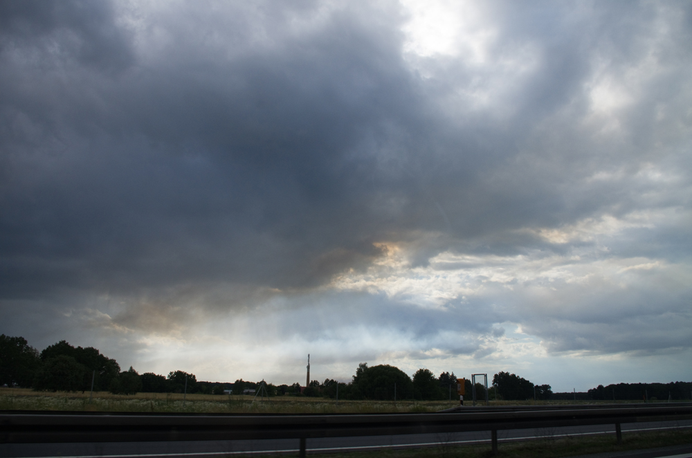Ich habe noch etwas vom Dienstag, dem 27.06. (Siebenschläfer) nachzutragen. Auf dem Heimweg von der Arbeit an der A13 habe ich einige Wolken mit Sonnenstrahlen ("Crepuscularstrahlen") gesehen, einige Regenschauer waren da auch mit dabei. Interessant war aber der rötliche bis bräunliche Farbstich an manchen Stellen. Als ich das zuerst in Nähe des Horizonts gesehen habe, dachte ich zuerst an einen Regenbogen oder Halo, so geeicht ist man schon auf diese Farbnuancen.