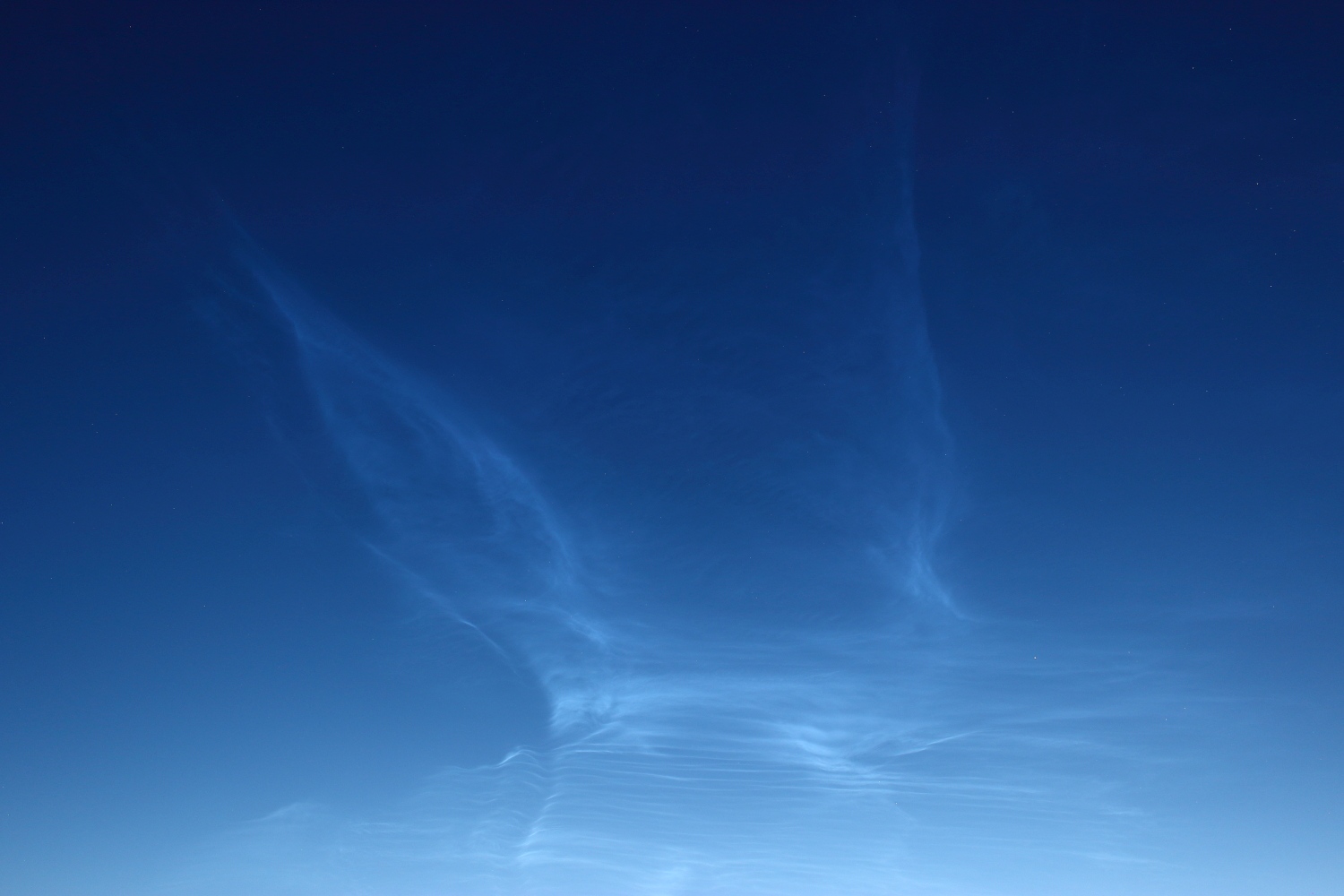 Als Einstieg in die Nacht hatte ich 0:28 - 0:31Uhr MESZ den wolkenlos klaren Nordhimmel bei Dalmsdorf (Mecklenburg) (53.4272N, 12.9323E) mit halbwegs dunkeladaptierten Augen abgesucht, und keine Spur von NLC erkennen können. Es wirkte aber "irgendwie verdächtig". :wink: Interessant der Vergleich mit der Kamera in Gahlkow zum selben Zeitpunkt: https://foto-webcam-mv.de/webcam/gahlko ... 07/06/0030