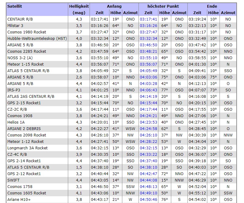 Die NOSS-Satelliten können sehr hell aufflaren, mein hellster war -4.5 mag: die können 6–9 mag heller werden, d.h. sie können schwächer als 5 mag sein und daher nicht auf der heavens-above Liste erschienen, und dennoch im Minusbereich aufflaren. Allerdings – wie schon geschrieben – habe (für 4:00 Uhr) ich keine passenden Erscheinungen gefunden; die Liste aller (?) NOSS kann unter "Satelittendatenbank" gefunden werden, unter "Name" ist NOSS* einzugeben. Allerdings muss man sich durch jeden einzelnen durchklicken.