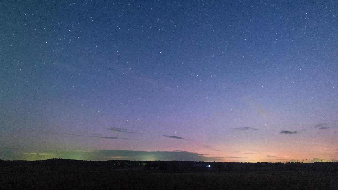 In der Nacht 25.07./26.07.2023 konnte ich ebenfalls Polarlicht in Form einer violetten (fotografischen) flächigen Verfärbung am Nordhorizont beobachten, auf die Schnelle habe ich es mit in den NLC-Faden zu dieser Nacht aufgenommen.
