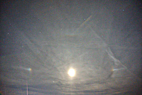 heute war hier in Kirchhain der Himmel mehr oder weniger mit Cirrostratus bedeckt, sodass fast ganztags immer irgendwelche Halos sichtbar waren. Unterbrochen wurde das Ganze am Morgen durch Nebel und abends teilweise durch Altostratus. Meist war der 22°-Ring nur sichtbar, unter anderem am Mond in der Nacht: