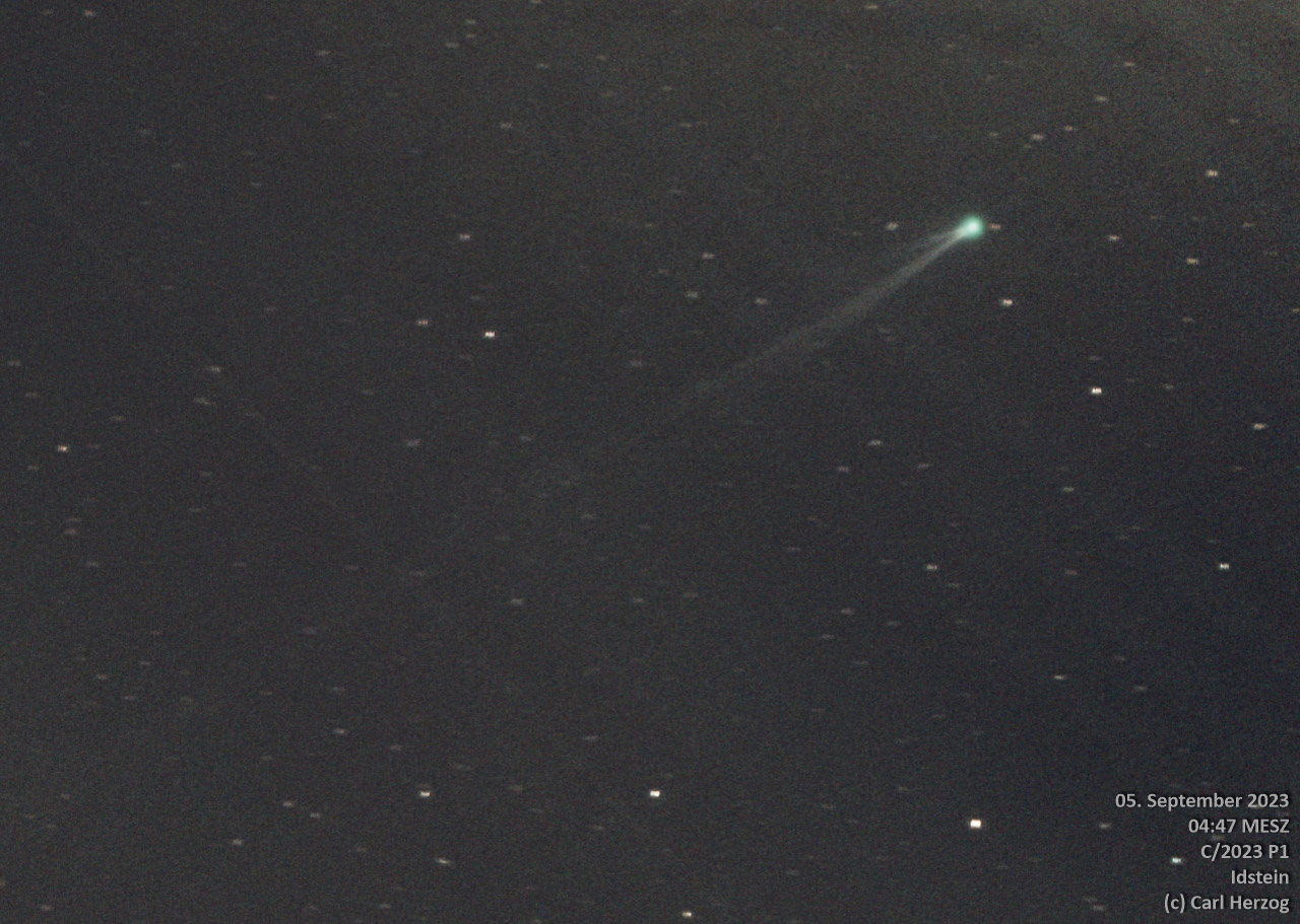 via Skyweek (runterscrollen bis unter die Perseiden) wurde ich gerade auf den neu entdeckten Kometen C/2023 P1 (Nishimura) aufmerksam, der Mitte September vielleicht ein interessantes Beobachtungsobjekt werden könnte. Letzteres kursiv, denn der Schweifstern ist nach derzeitiger Kenntnis ein Kandidat für eine vorzeitige Auflösung (s. https://www.facebook.com/photo/?fbid=700742702067209).