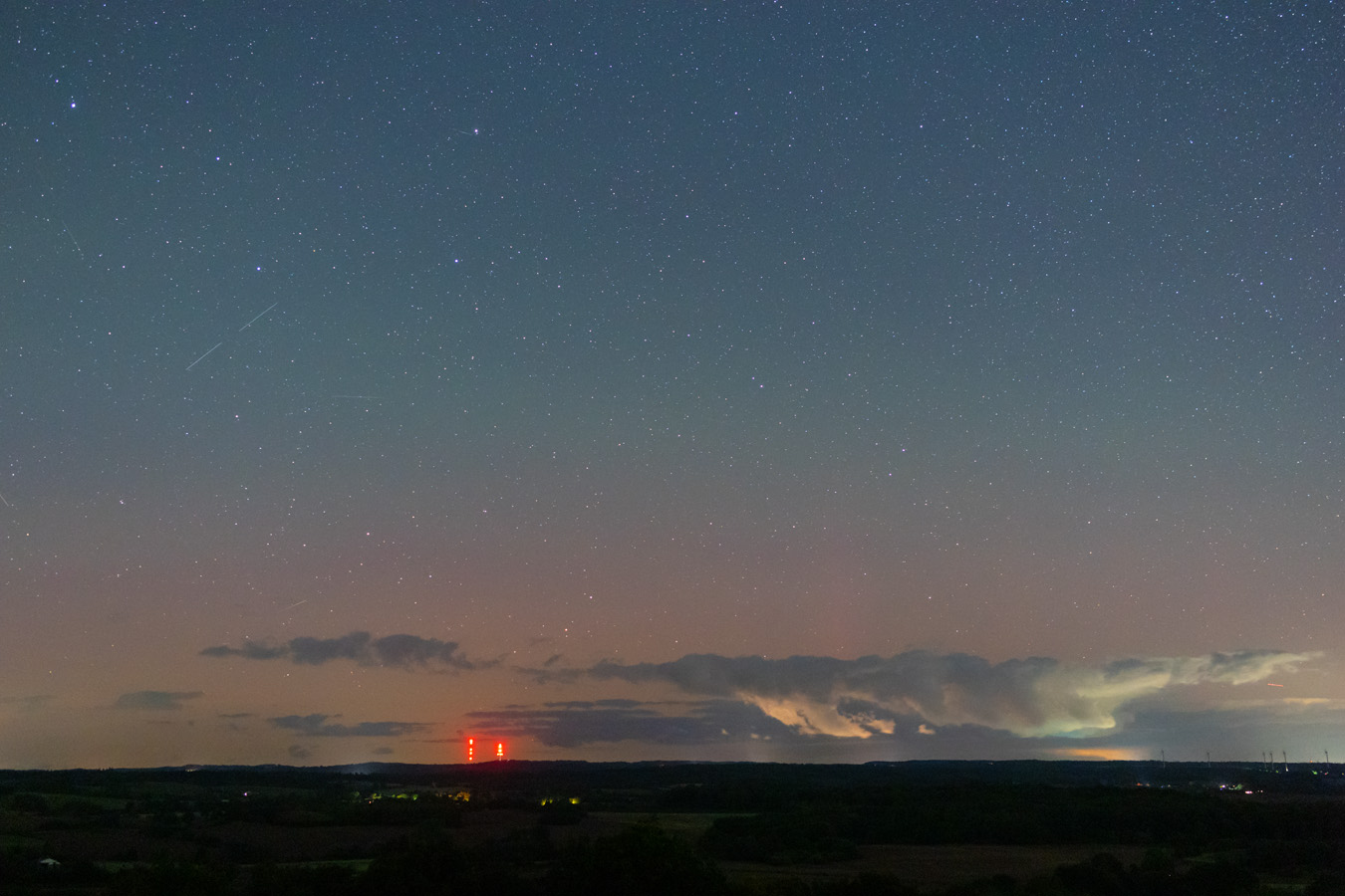 Ich war ab ca. 21:15 am Gömnitzer Turm auf knapp 100 Meter Höhe. Von dort ergibt sich ein wunderbarer Rundumblick. Im Norden liegt der Bungsberg und es gibt in der Richtung nur sehr wenig Lichtverschmutzung. Zunächst zogen von Norden noch einige Wolkenfelder durch, die aber wenig störten und sich später weitgehend auflösten. Die Durchsicht war sehr gut.