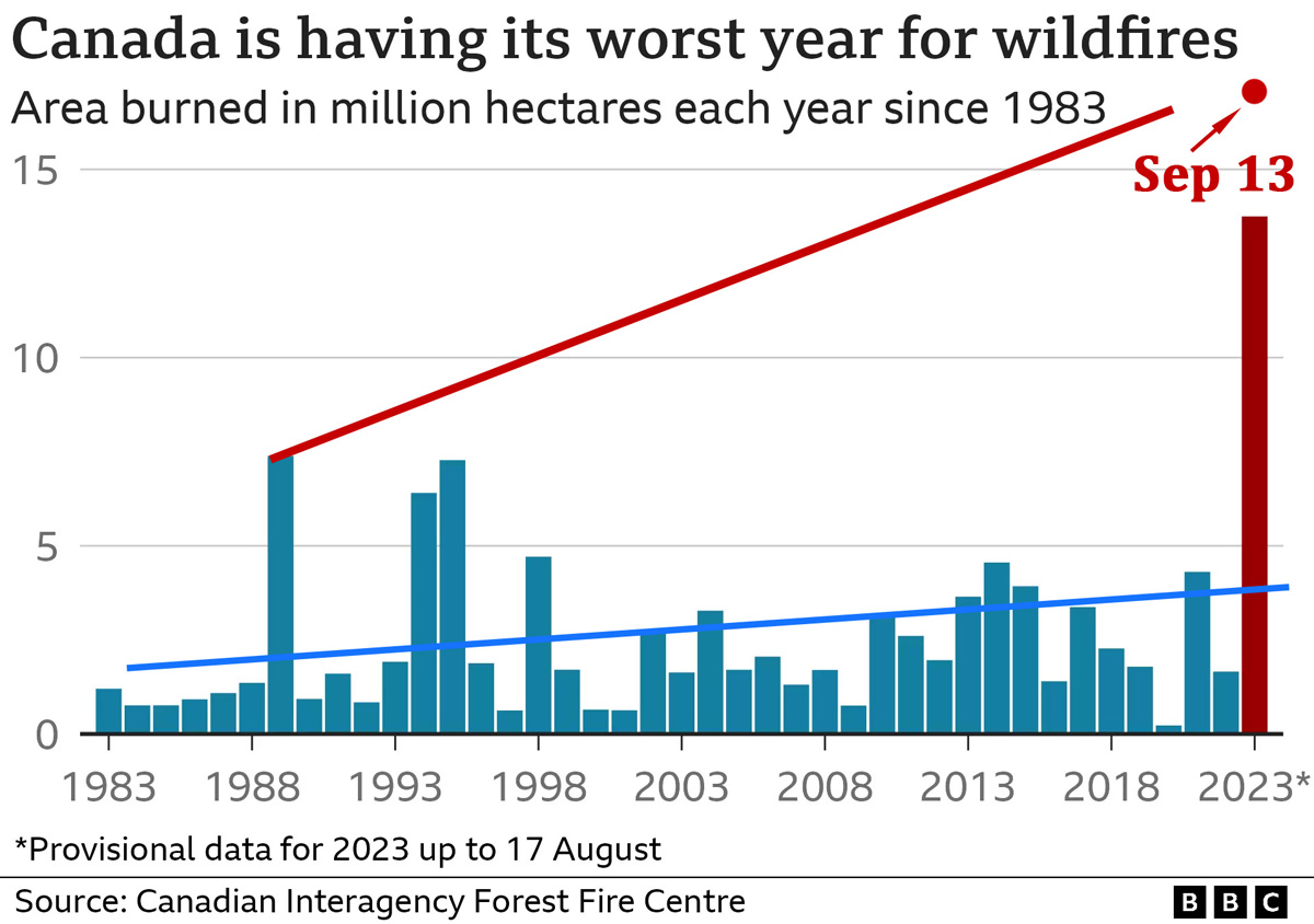 Kürzlich fand ich auch interessante Zahlen zur diesjährigen Waldbrandsaison in Kanada, es war schon im August mit großem Abstand die heftigste Waldbrandsaison (und der Rekord wurde bereits Ende Juni geknackt), die jemals registriert wurde und inzwischen sind nochmal zwei Millionen Hektar (20.000 km² !) verbrannte Fläche dazugekommen, also mehr als in vielen Saisons insgesamt gebrannt haben.