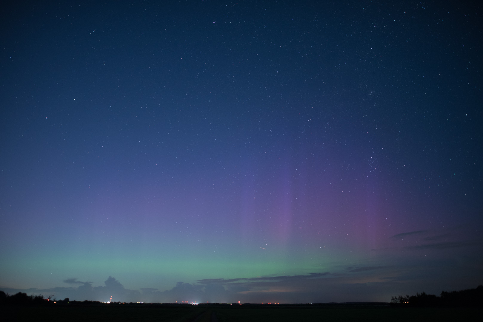 Hier bei Würzburg (50° Nord) haben sich die Wolken erst gegen Mitternacht verzogen. Ab 01:20 Uhr MESZ konnte ich dann den rötlich-violetten Himmel auf den Fotos erkennen (Canon EOS 6D mit Tamron 17-35mm bei 17mm, f 2.8, ISO3200, 25sec).