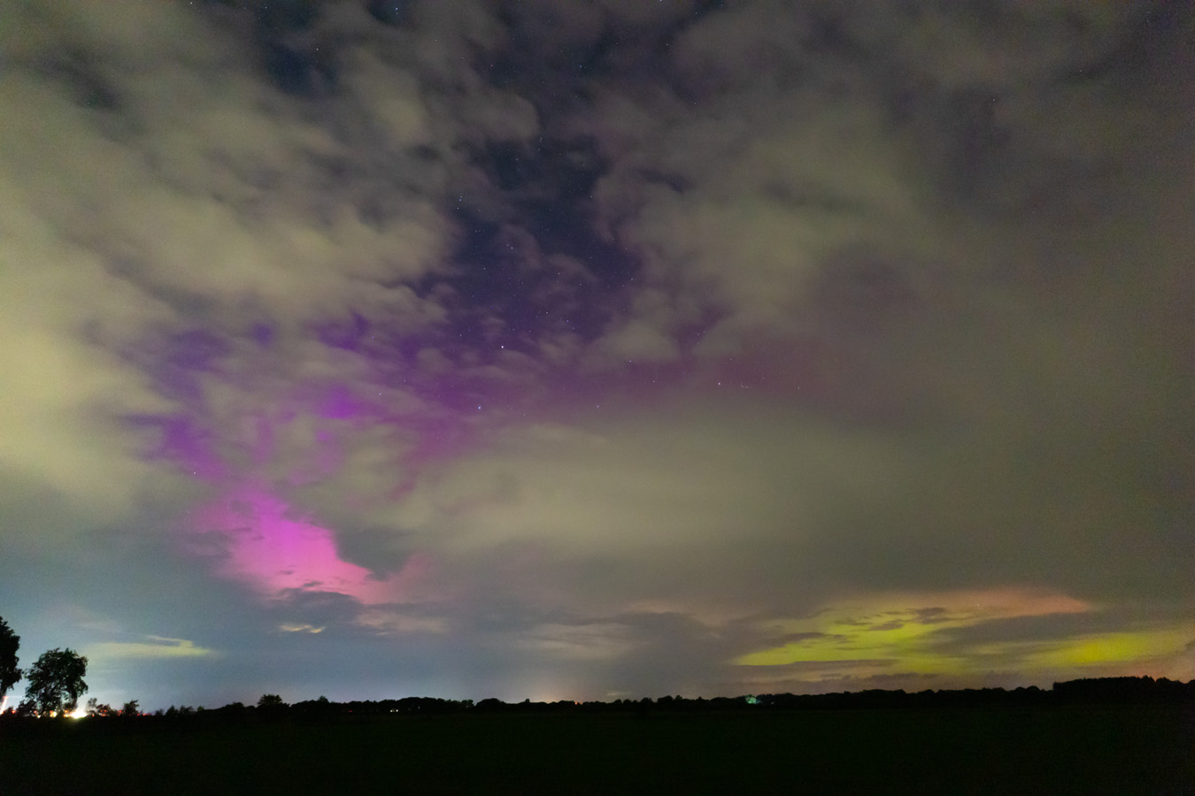 Hier in Südhessen (50,2° Nord) war gestern gegen 21:30 auch eine leichte rötliche Färbung des Nordhorizonts fotografisch erkennbar (rechts unten im ersten Bild):